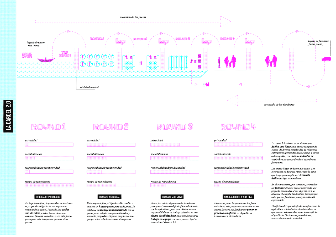 According to the philosopher Michel Foucault on “Discipline and Punish: The Birth of the Prison”, the benefits of the prison must be lower than the punishment. That is why the first stage is full of transparent glass cells in which inmates suffer from a whole lack of privacity (that is even worse than being locked up). In the second stage, the inmate acquires a little bit of intimacy and owns a piece of allotment in order to learn agriculture techniques. In the third stage relationships among prisioners are closer due to they work together in a desalination plant as they recover more privacy and intimacy as well as they socialize with their peers. In the last stage inmates live along with their families and friends and put into practice all the techniques with agriculture and water to find a job in Carboneras.