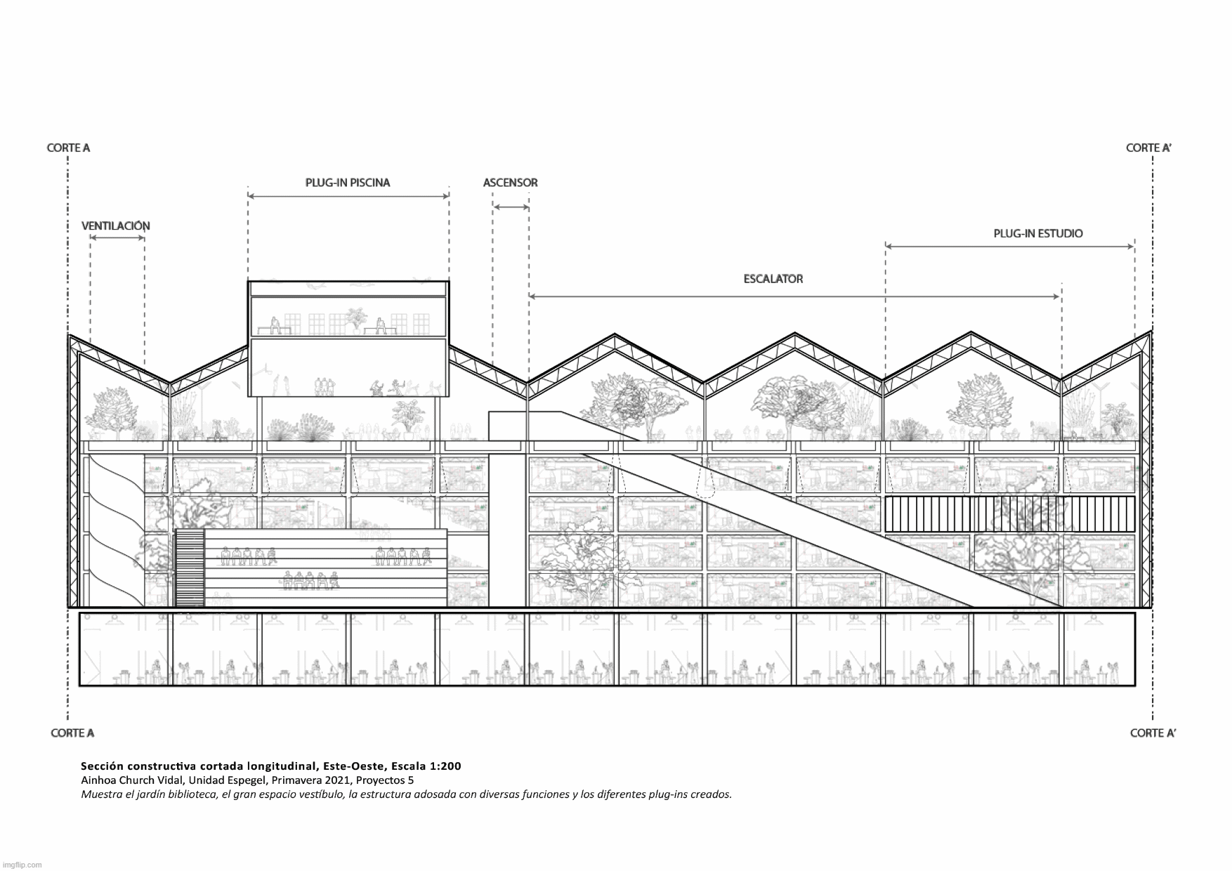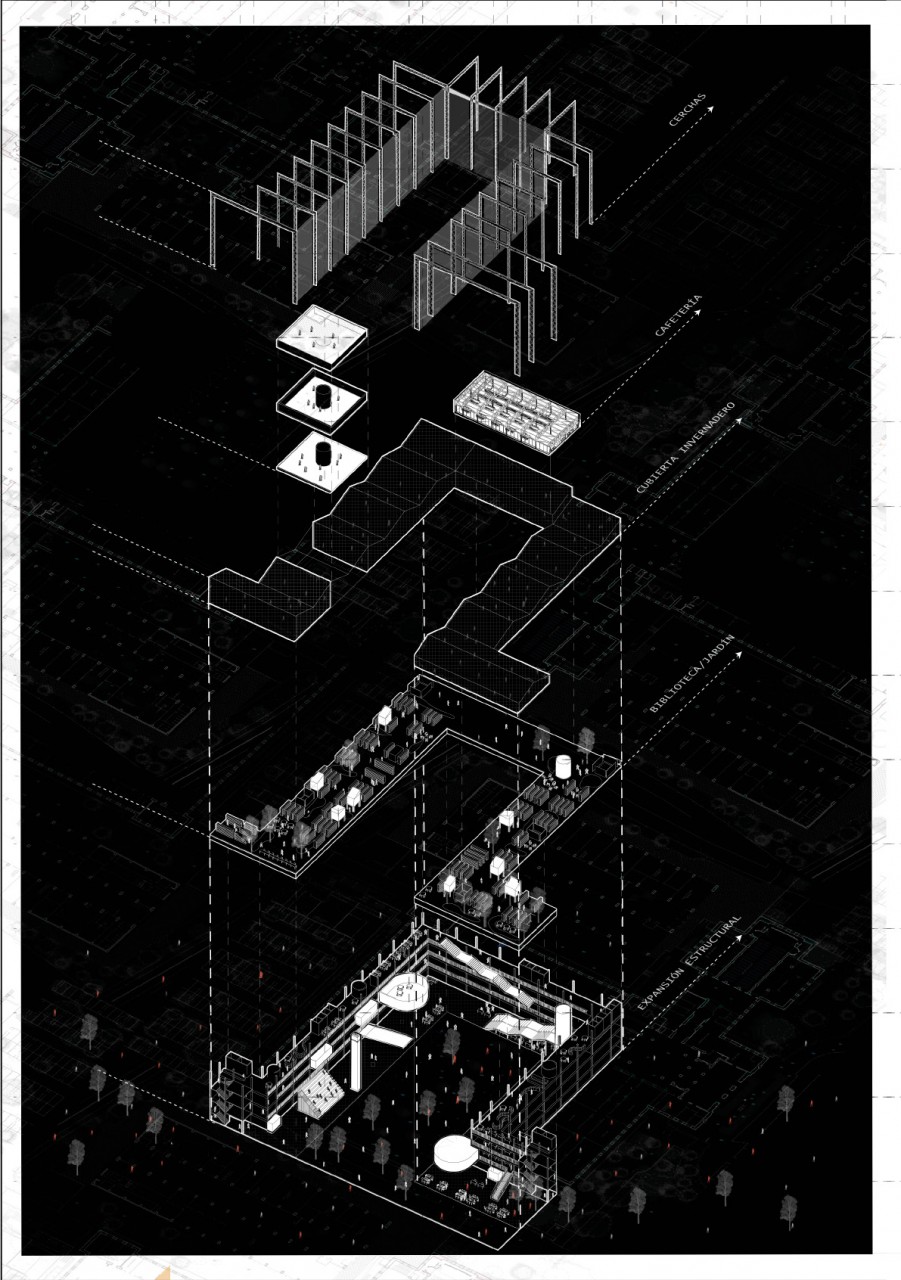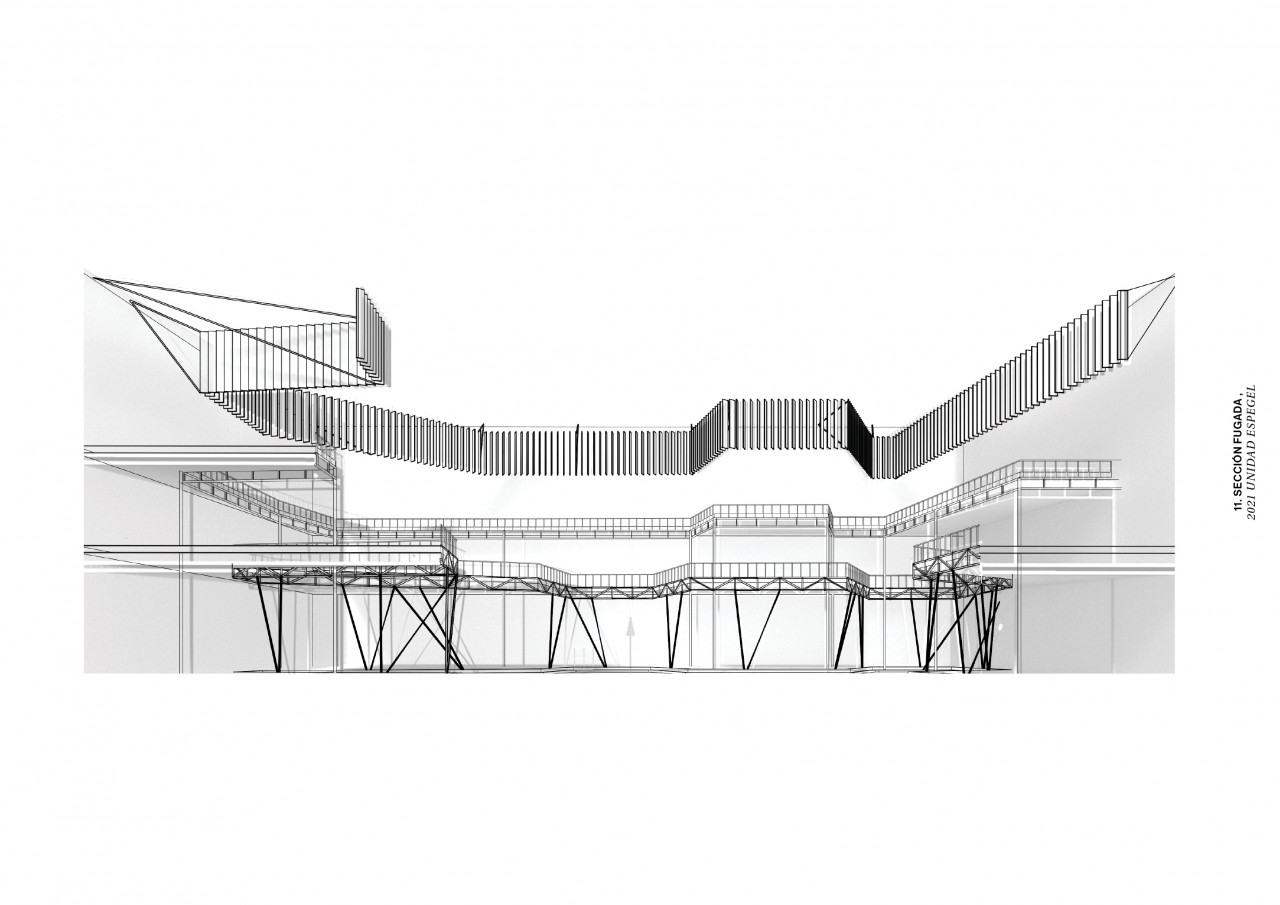 Attached to the pre-existing university building, we have a longitudinal strip of four and five floors. This strip acts as a connecting link between the pre-existing structure and the new one. Its primary function is to expand the original classrooms, giving them greater flexibility when using them. This longitudinal band is related to the lower public square, completing and reinforcing all the students' academic activities.