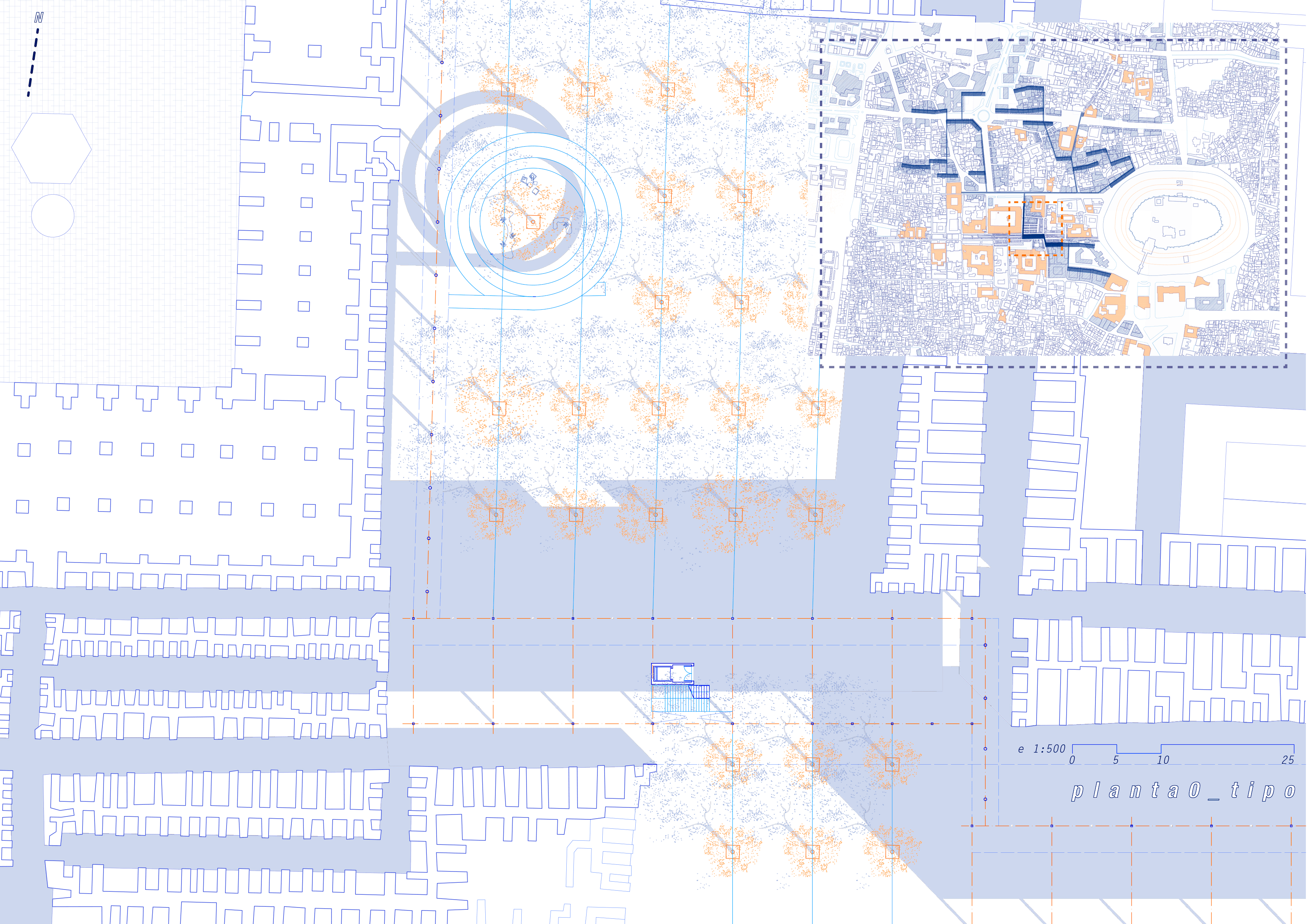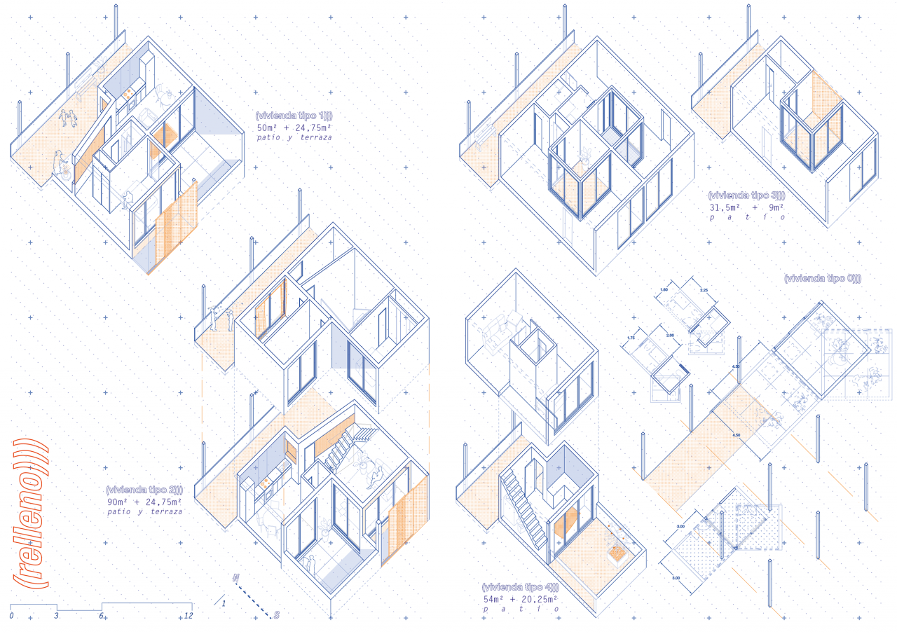 Secondly, the layout interweaves the elements of the disrupted city, complementing and interlacing them with new structures. On one hand, these show affinity with the historic city in terms of scale, and on the other, with the patio-house typology. At the same time that the aerial streets redraw the public space and offer new green areas for the city, they concentrate pedestrian circulation and give access to the dwellings.