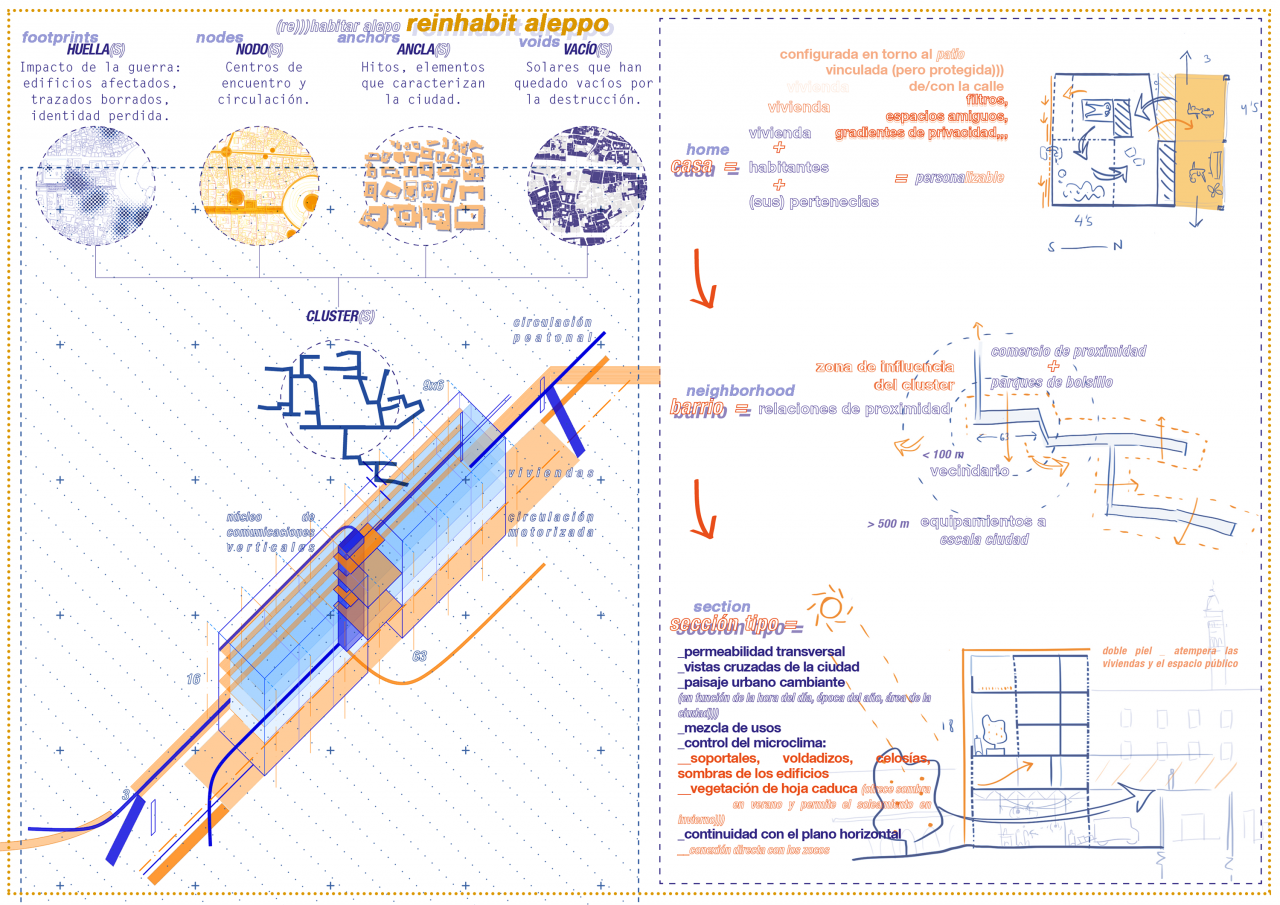 The motivation of this project, carried out during the Spring term in Tuñón Unit, is to look into Aleppo’s destruction state after the Syrian Civil War. After studying diverse types of urban proposals for the reconstruction of post-war cities, along with typical patio-houses examples, the aim is to develop speculative proposals that give solutions to the re-urbanization and re-inhabitation of the ancient city.