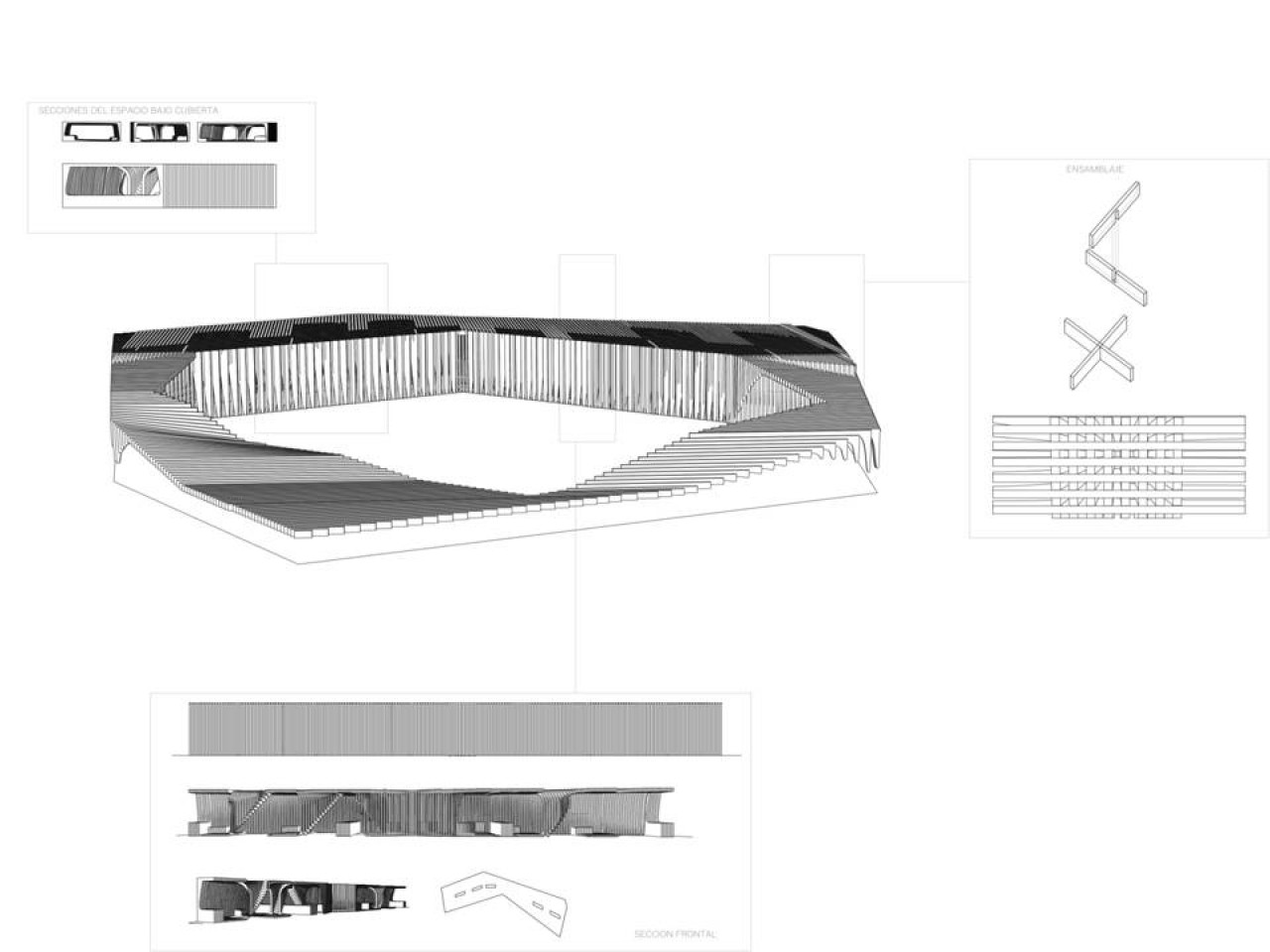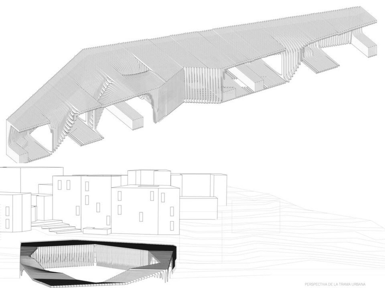 The second project corresponds to the spaces created from 2 dimensions. Following the previous thread, the proposal focuses on a unique method capable of solve the whole project in its unit. In this case, the method used is the lamination, the stacking of 2D sheets that allow through a sequential union the creation of a third dimension, transforming the plane into space. The project is located in the crowded and chaotic Medina of Fez. The objective: To create an oasis in the middle of it, a cool, shady and landscaped space in which to rest from the frenetic pace of life in Fez. A contrasted area, a crisis of the density in the urban fabric. To this end, a series of urban reforms will be carried out to allow the reactivation and connection with the river, as a continuous dynamic axis between different public spaces covered by it. The project aims to be a global intervention, not punctual, in which the excavation of the square at river level and the flooding of it as a starting point take special importance.