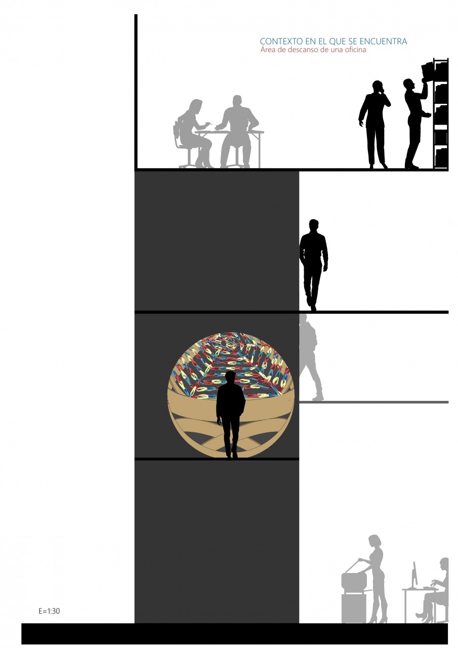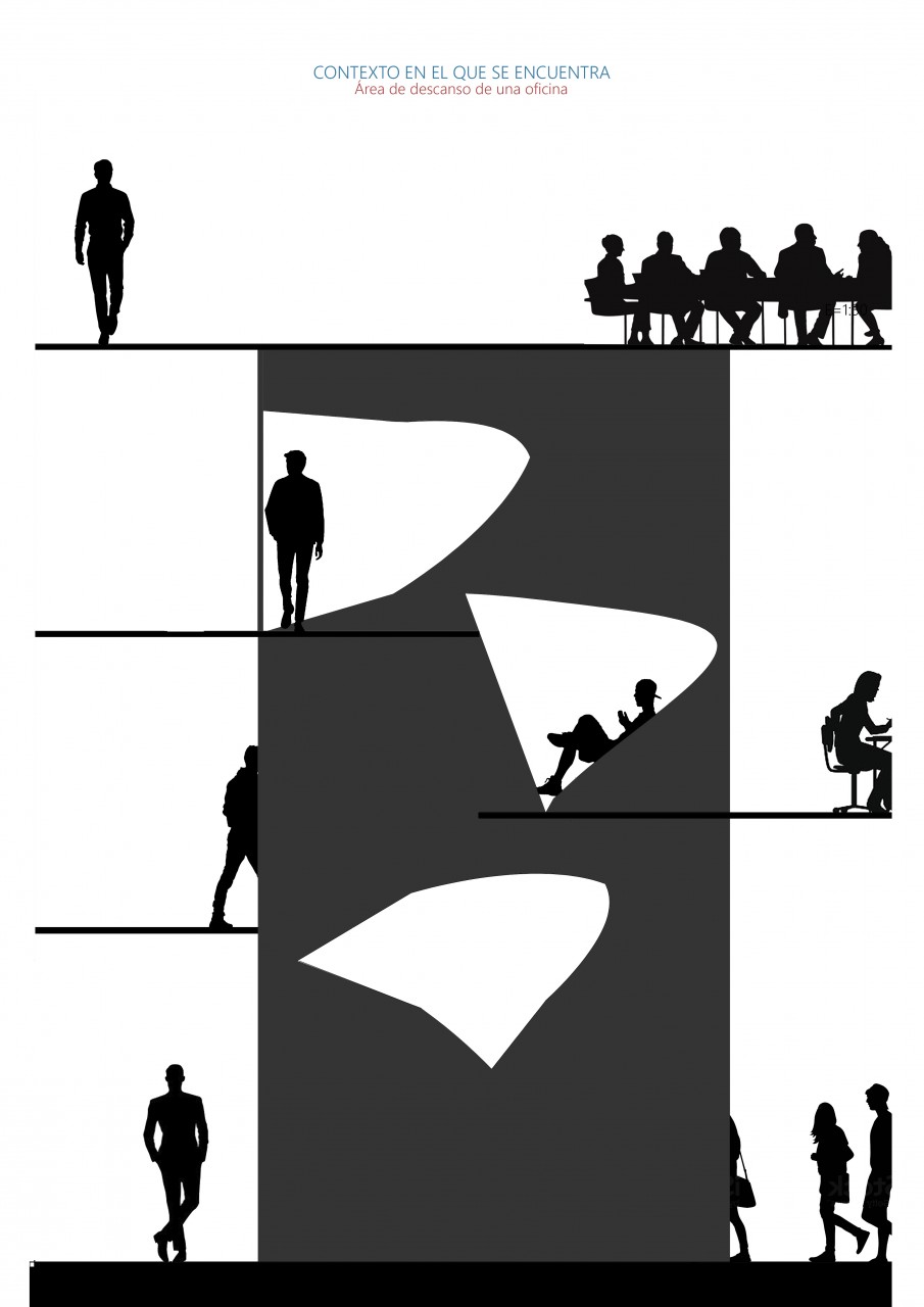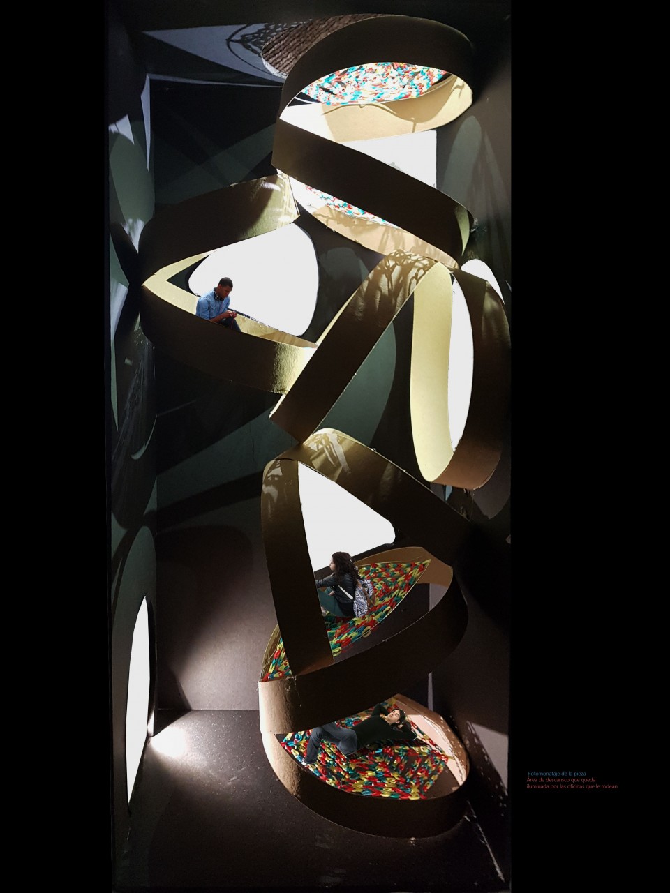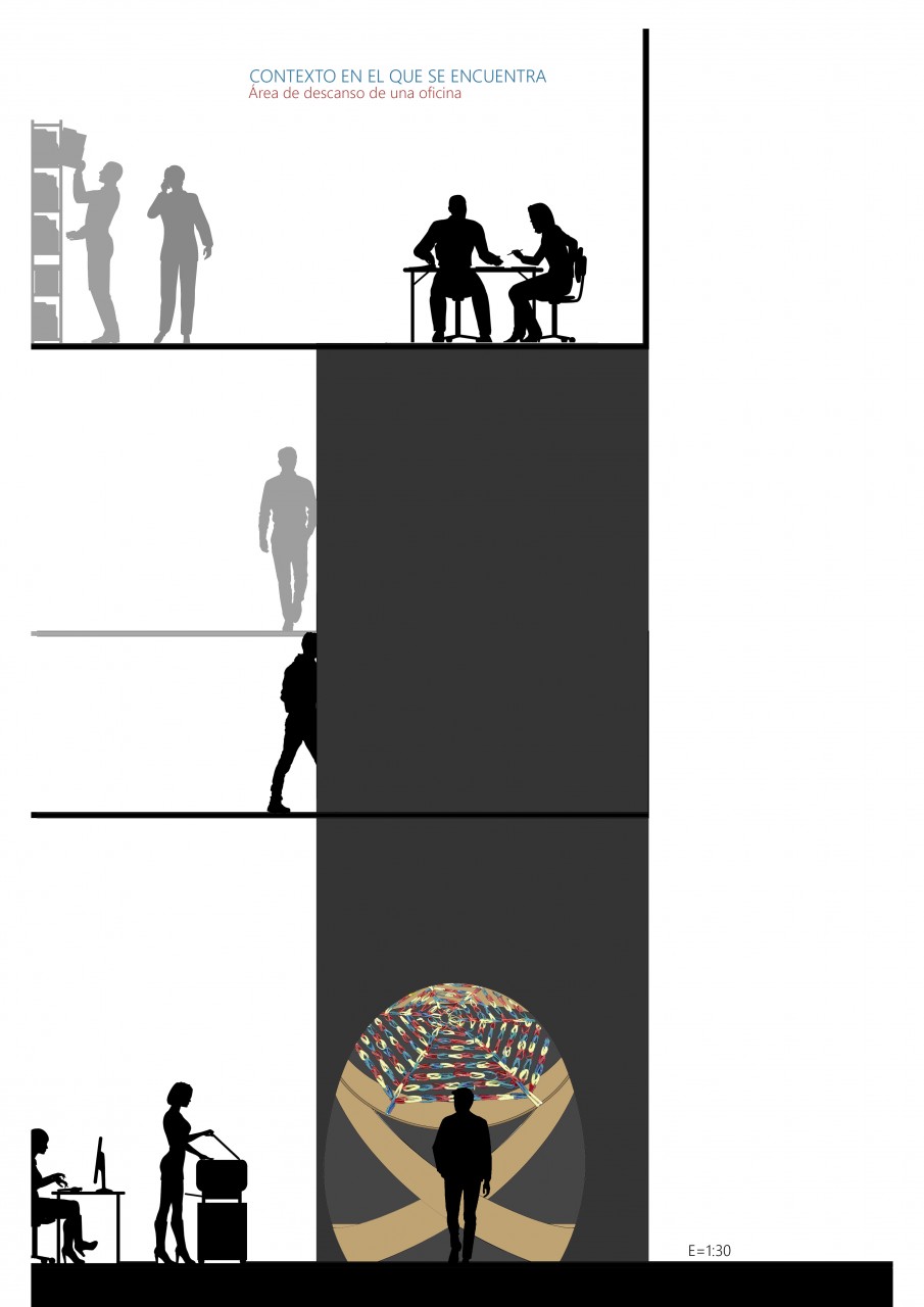 My proposal is a rest area or break room for employees of an office building. The relation between the estructure (created of a pile of 5 chairs) and the box is one of the most important parts of my project. Inspired by Matta-Clark and his "building cuts", I realized some cuts in the box in order to create the different acces to the rest area.