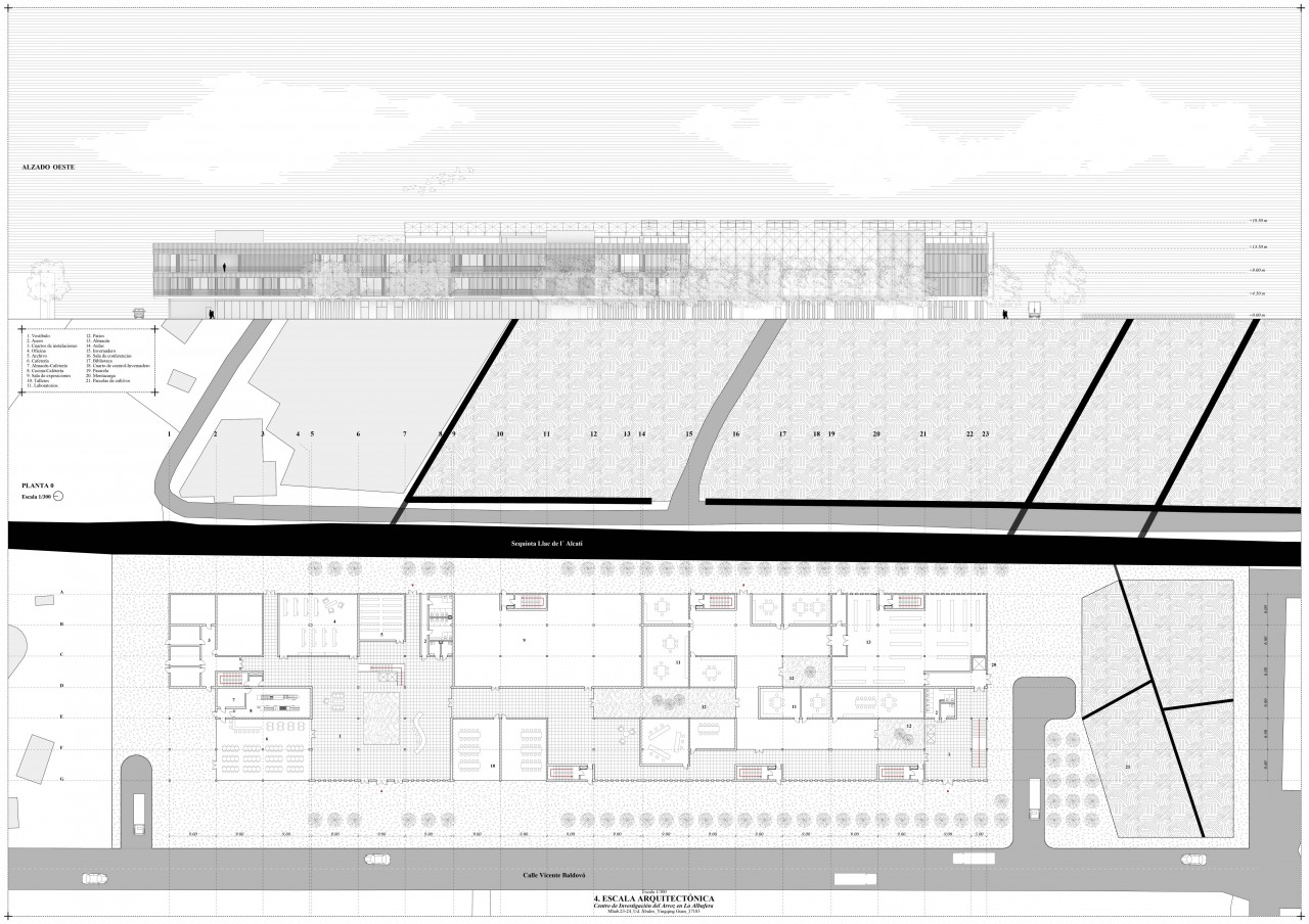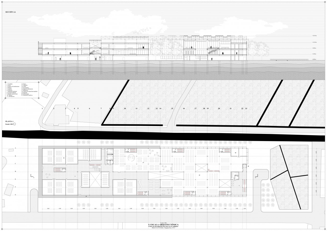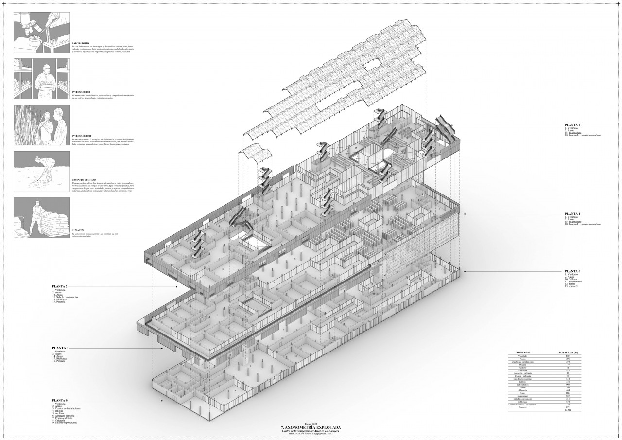The building has three floors. It features three courtyards that improve ventilation and lighting. On the ground floor, there are installation rooms, an office, a cafeteria, laboratories, workshops, a warehouse, and an exhibition hall about the Albufera ecosystem. The first floor houses classrooms, a library surrounded by a walkway, and a greenhouse. The top floor has the similar organization.