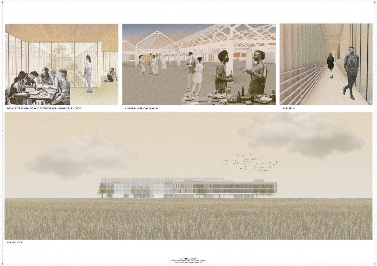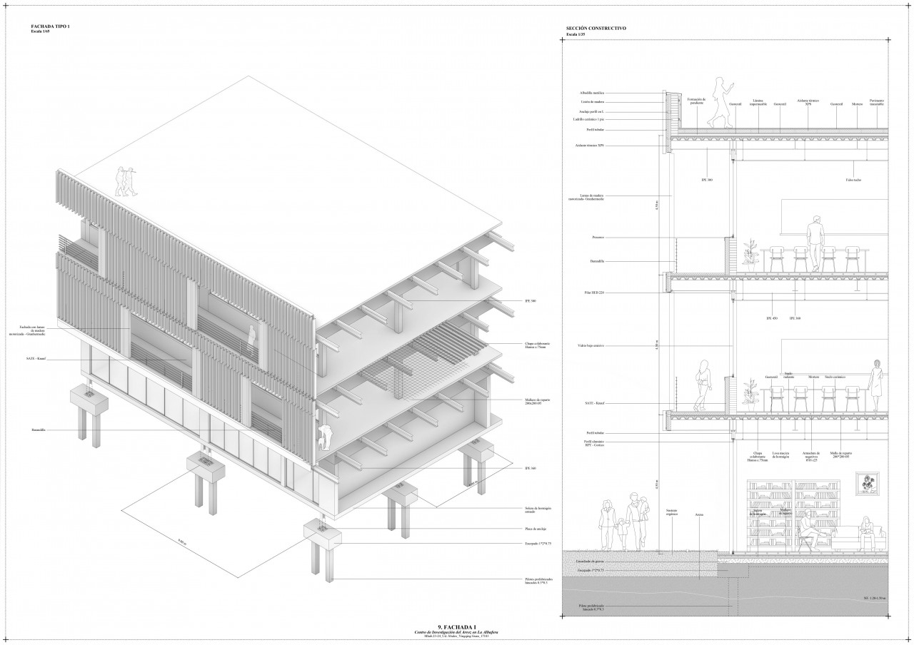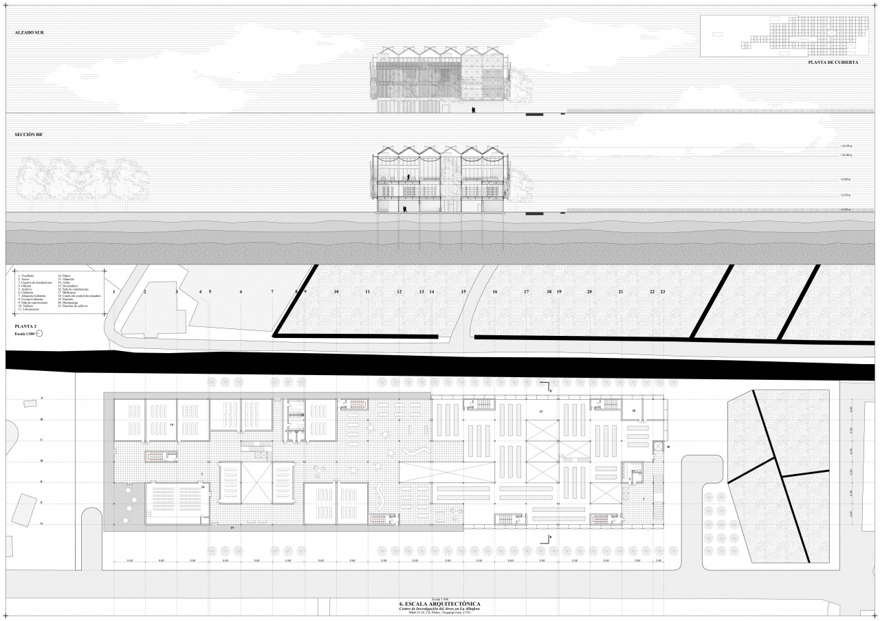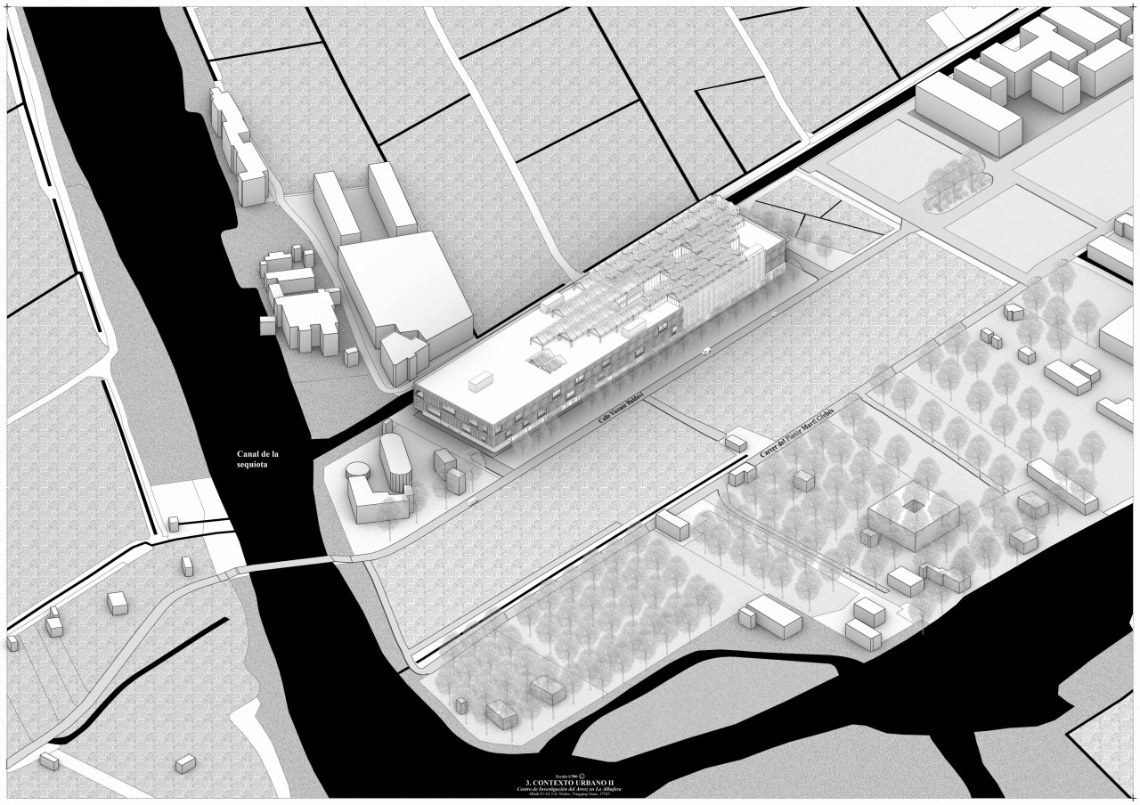 The building has three floors. It features three courtyards that improve ventilation and lighting. On the ground floor, there are installation rooms, an office, a cafeteria, laboratories, workshops, a warehouse, and an exhibition hall about the Albufera ecosystem. The first floor houses classrooms, a library surrounded by a walkway, and a greenhouse. The top floor has the similar organization.