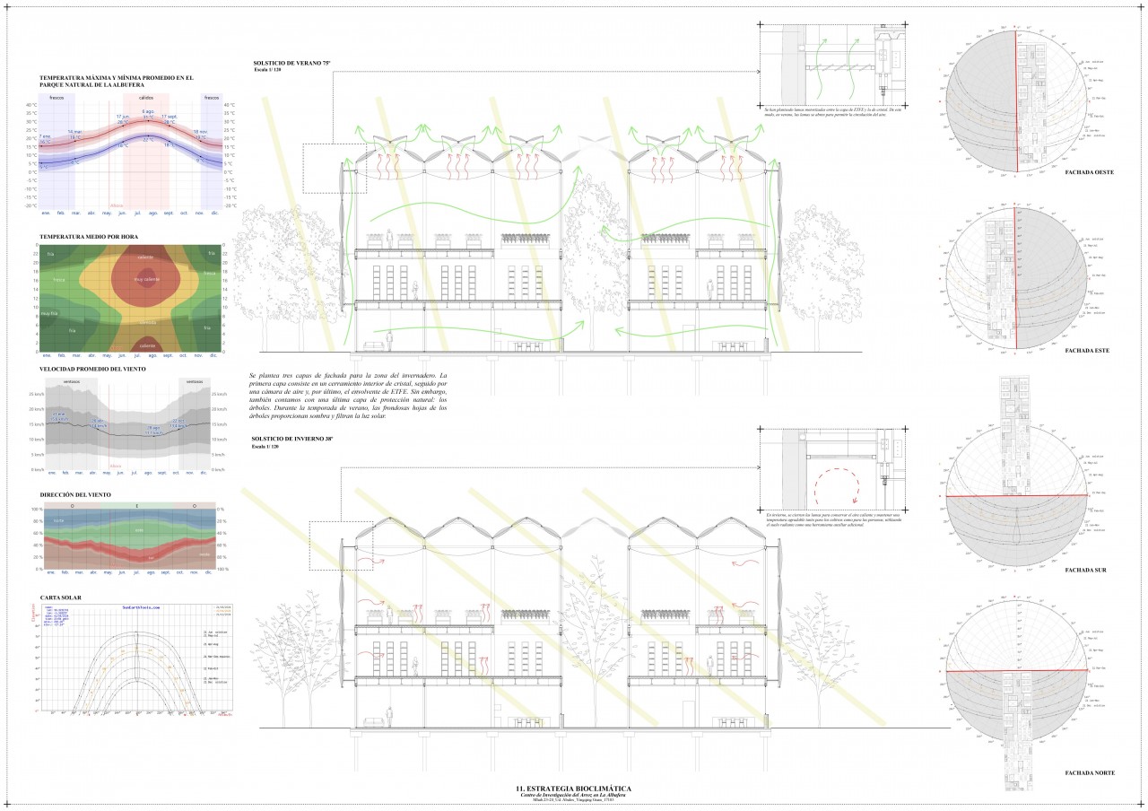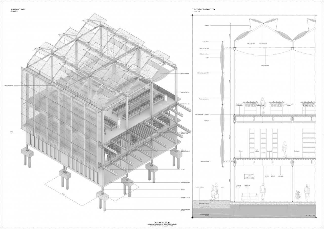 Due to the hot climate, all sides of the building are protected from the sun. For the teaching area, motorized wooden slats adjust their angles according to the sun's position. The greenhouse facade uses inflated ETFE cushions and low-emissivity glass, maintaining constant temperatures and improving ventilation.