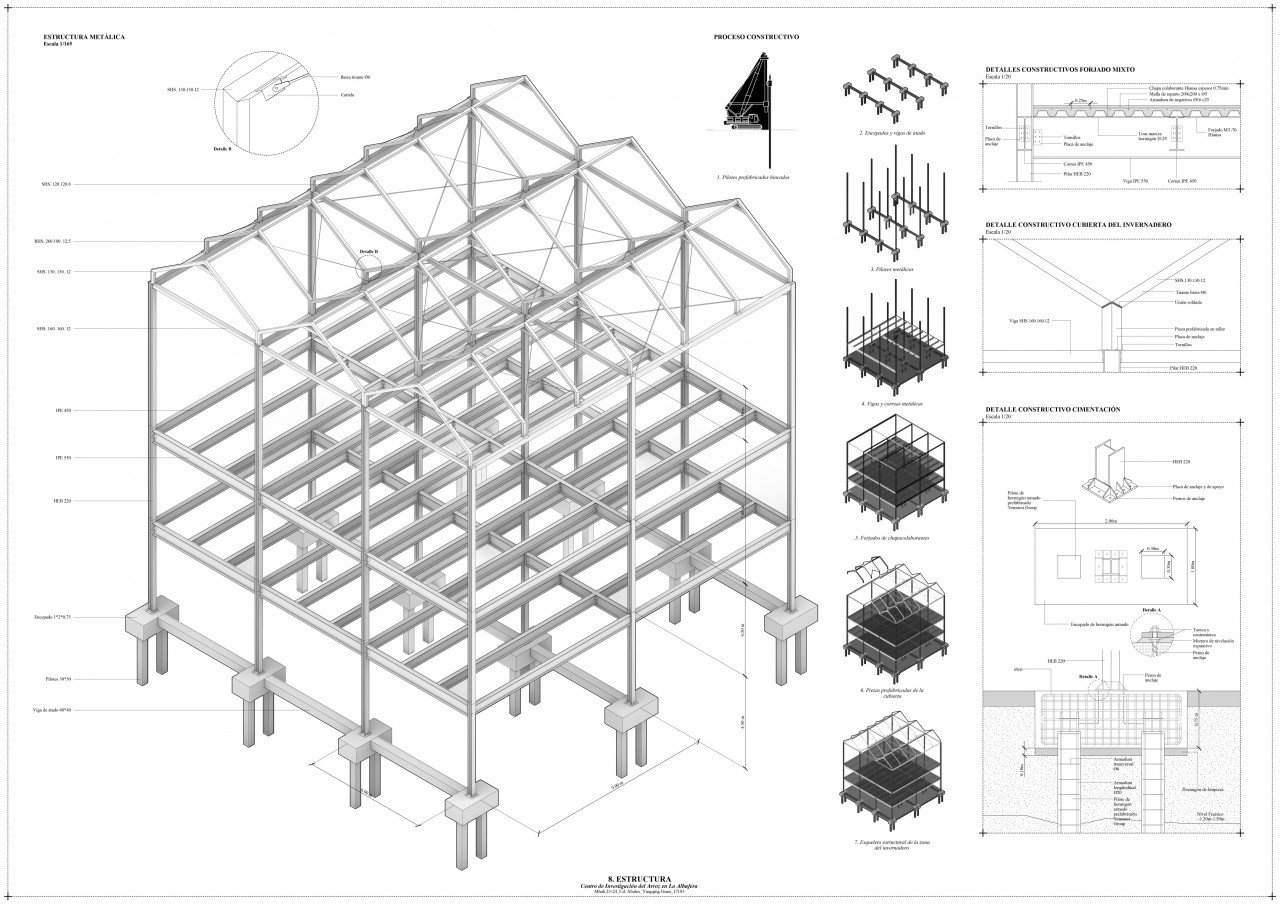 The building’s structure is metal, with 6 by 9 grid frameworks and composite slab floors. For the greenhouse area, a gable roof with prefabricated pieces was chosen.