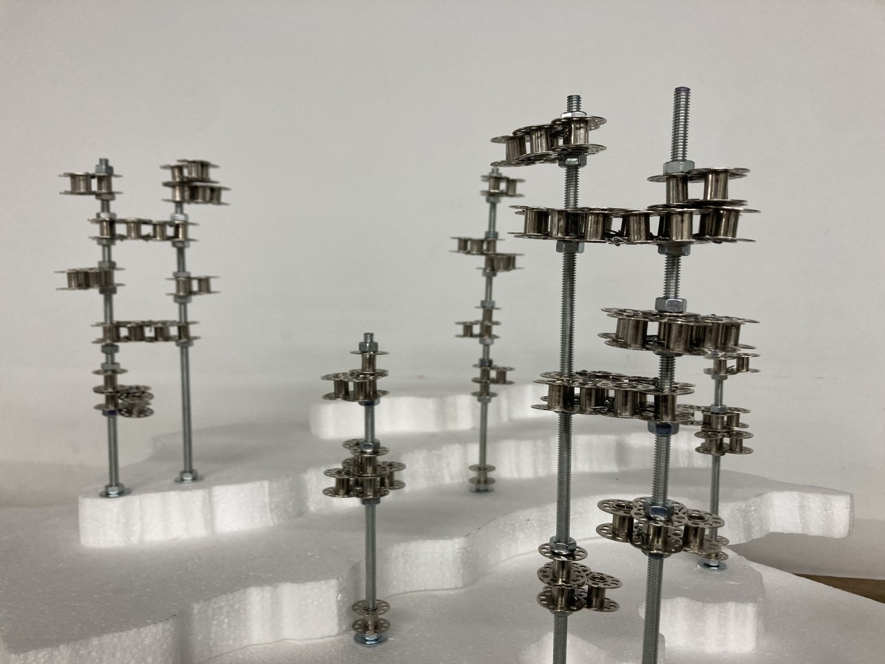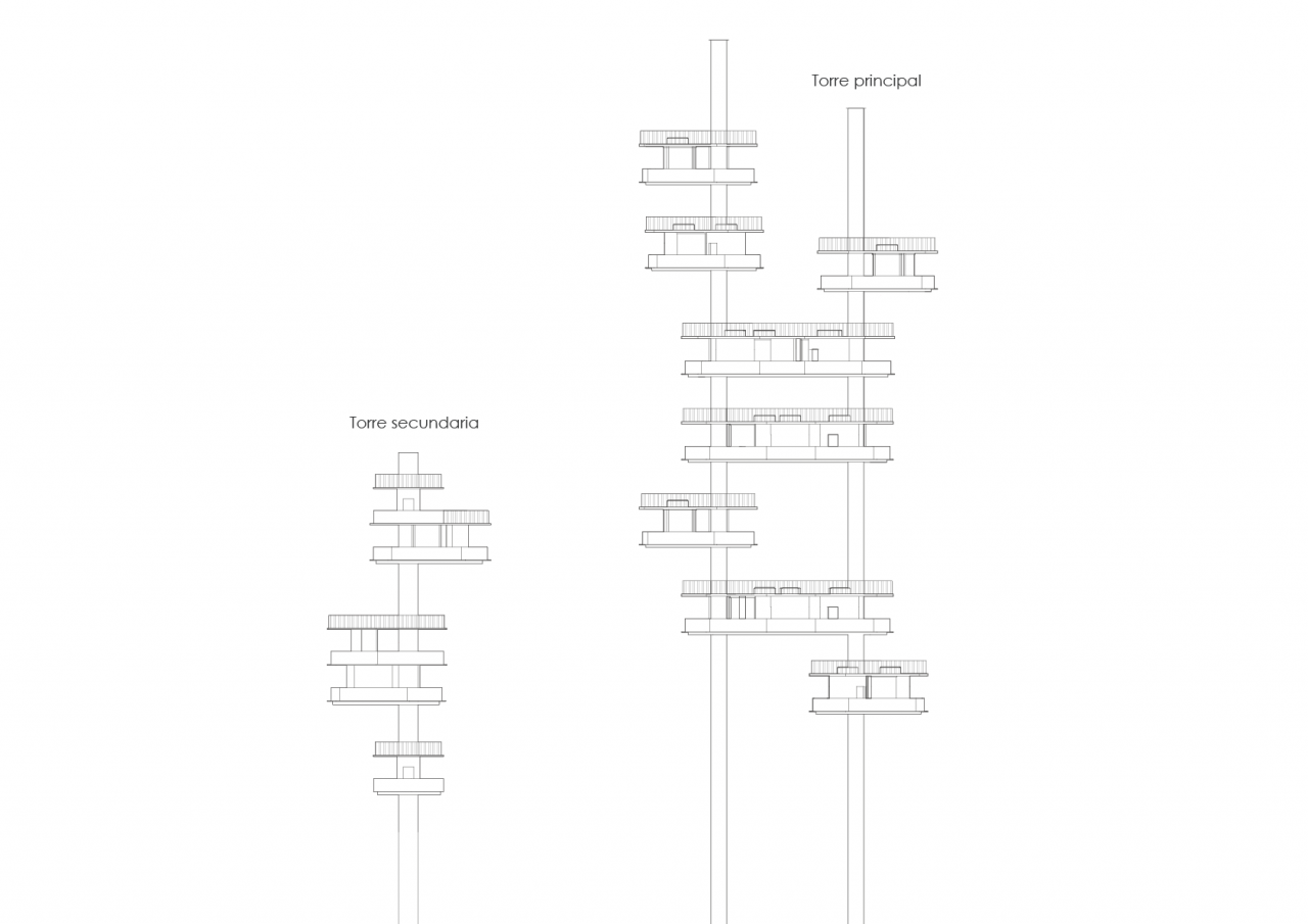 The essence of the design of both towers is the same, they both are born from the superposition of platforms which are made with bobbins and set up the different levels. All the platforms are connected with rods which create the vertical connections and also work as the structural support.
