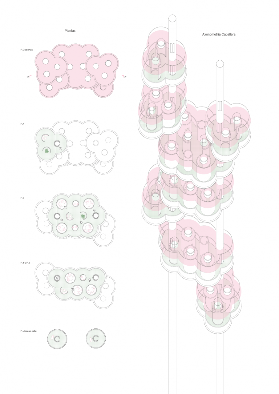 If we break down the parts of the platforms, we can see a path between cylindrical walls, distinguishing the privates (the rooms) and the common zones. We could also stand out the accessible roof or the skylights.