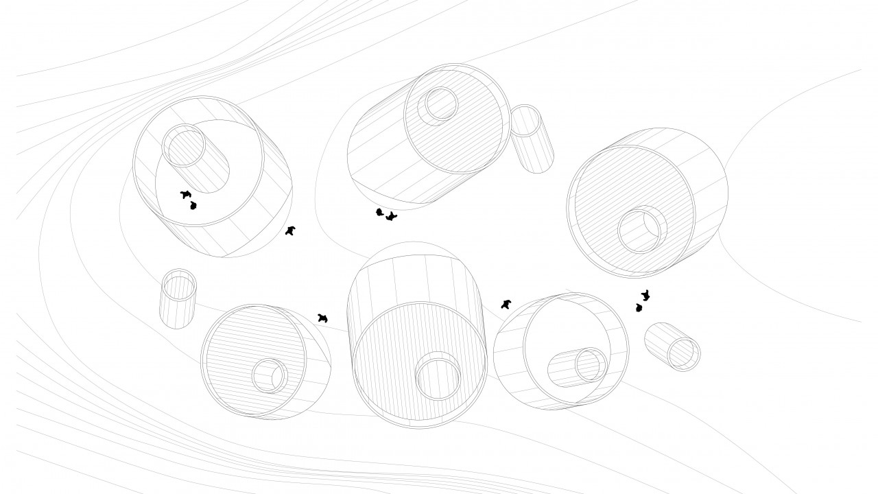 The rooms generate roundness due to their size and orientation, while causing some instability due to their inclination.