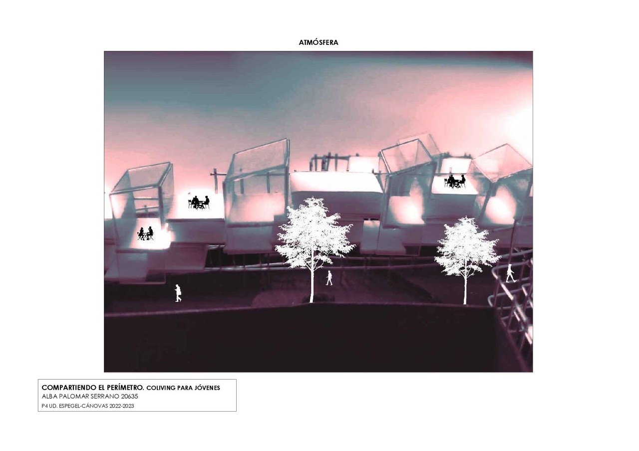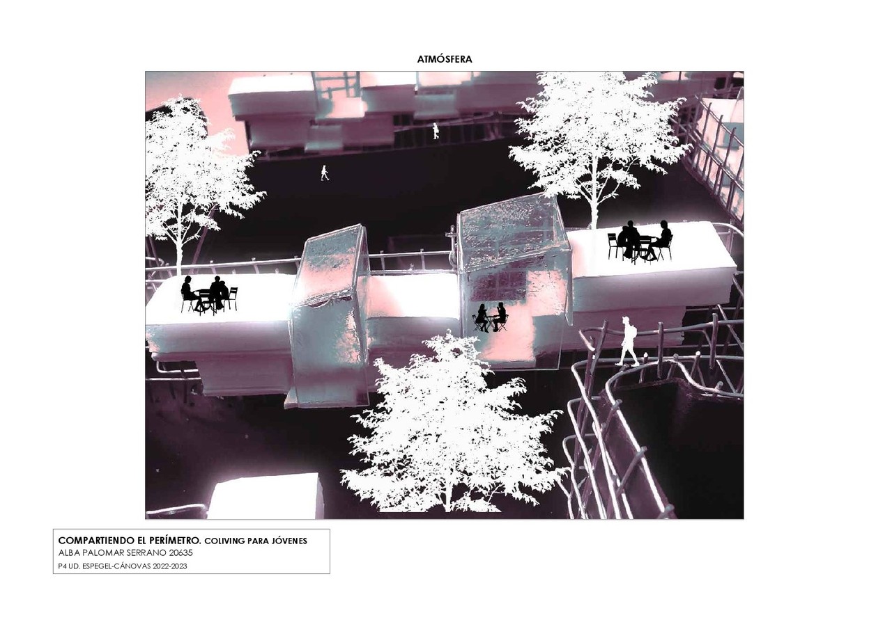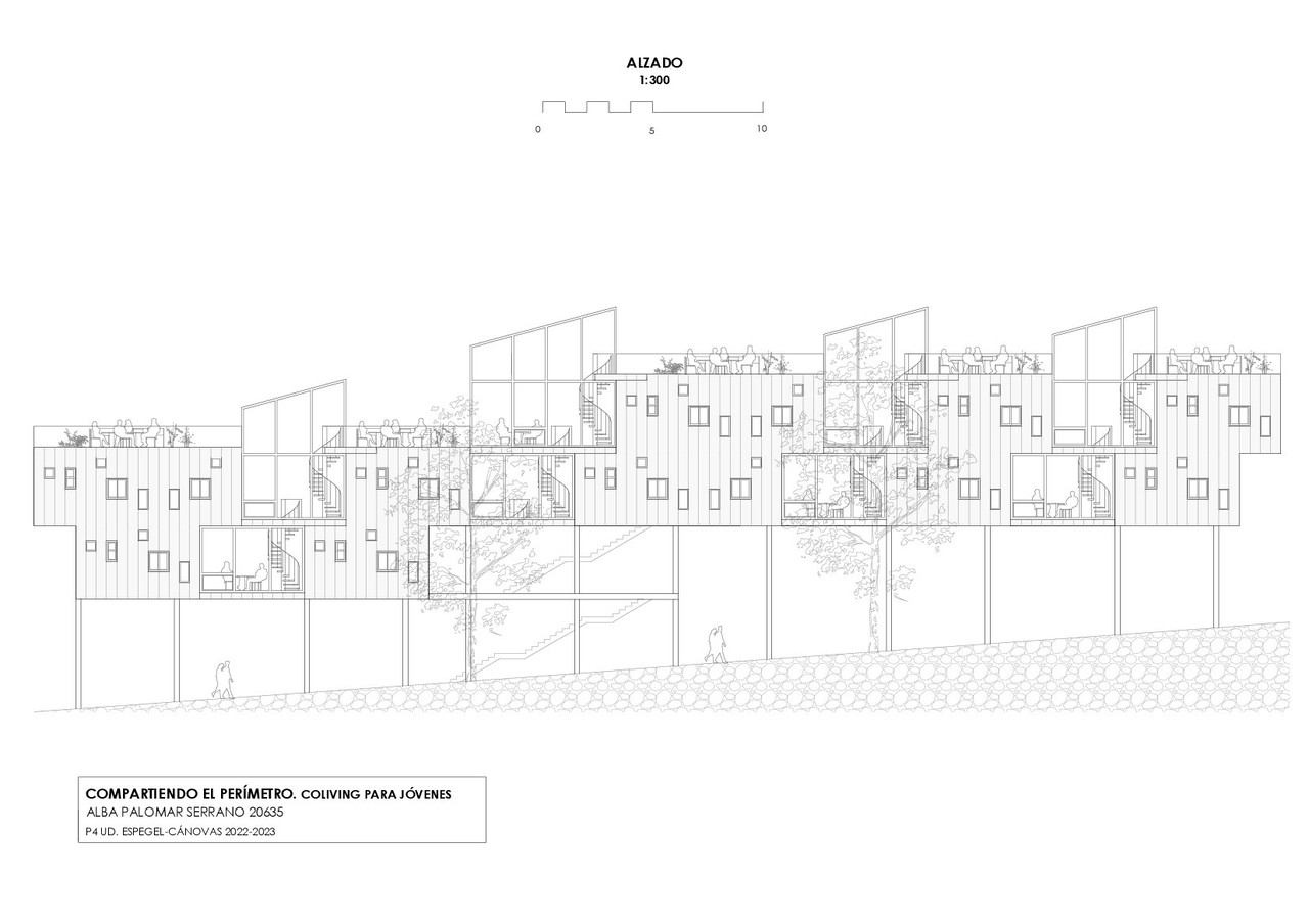 An elevated perimeter path acts as the backbone of the project, generating large interior voids that will allow sunlight and the growth of vegetation. The housing cells are attached to this route, whose configuration allows the appearance of interstitial spaces for collective coexistence that break with the idea of traditional housing. The very nature of the perimeter route completes the program with open spaces for walking, work and leisure, all of them focused on the development of these activities in common.