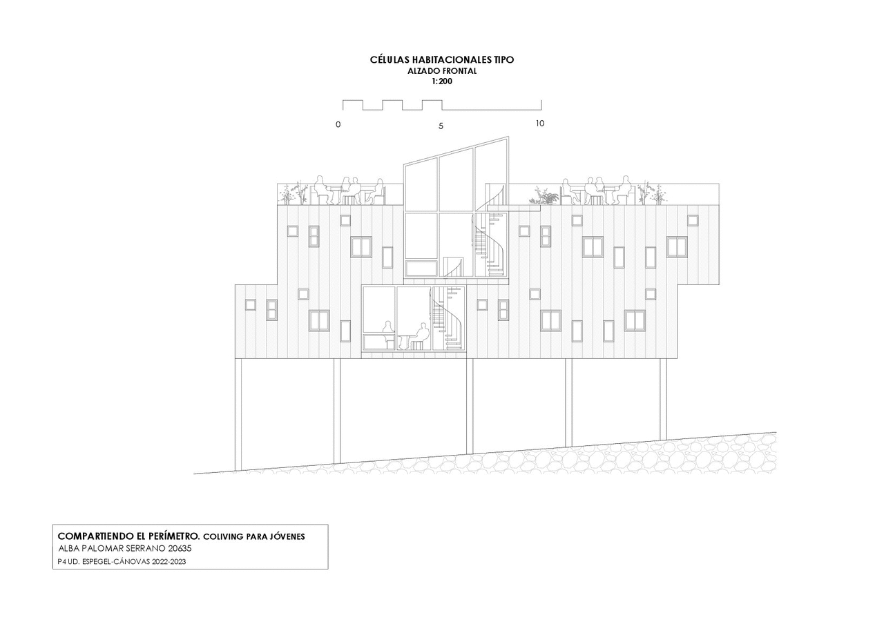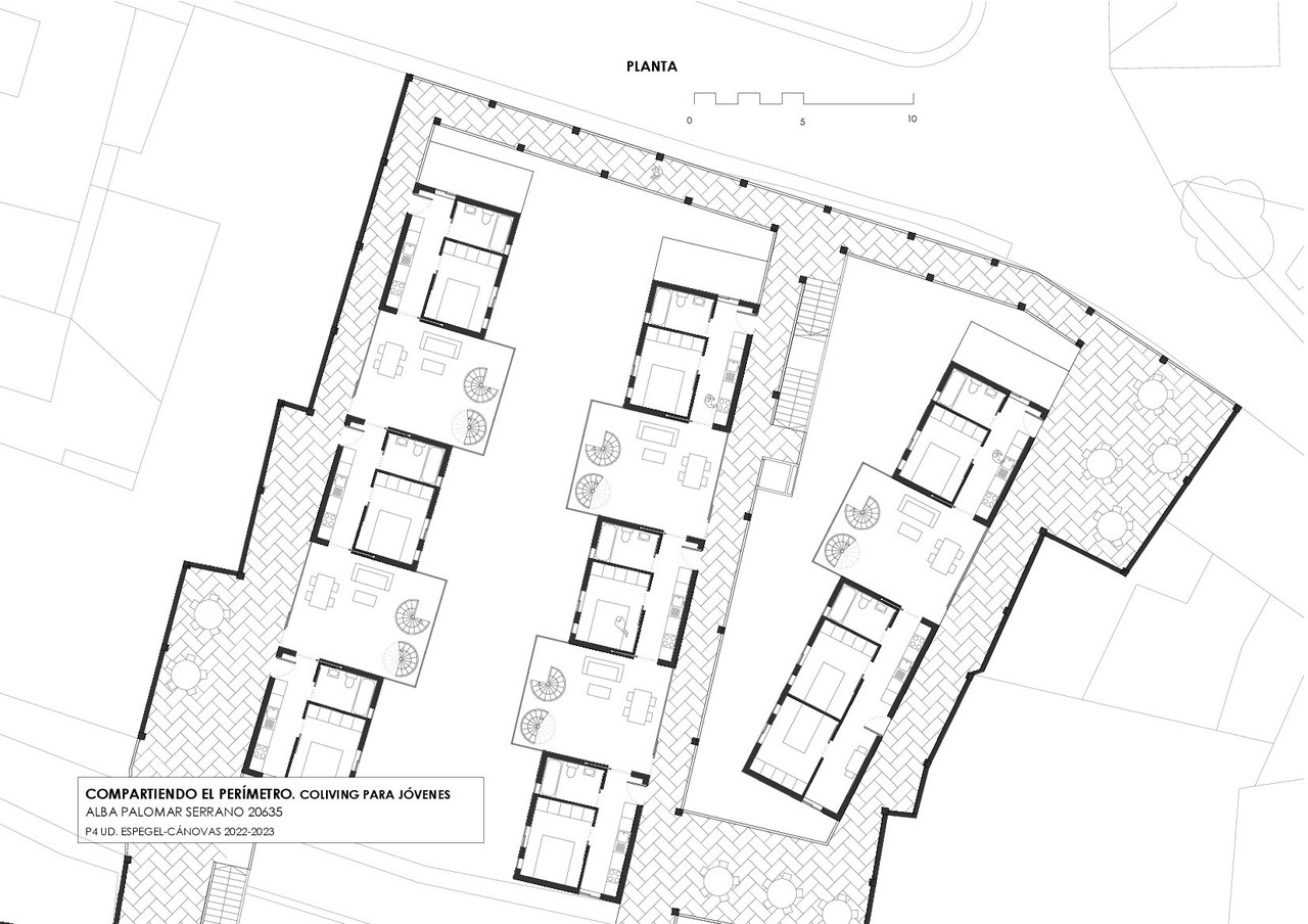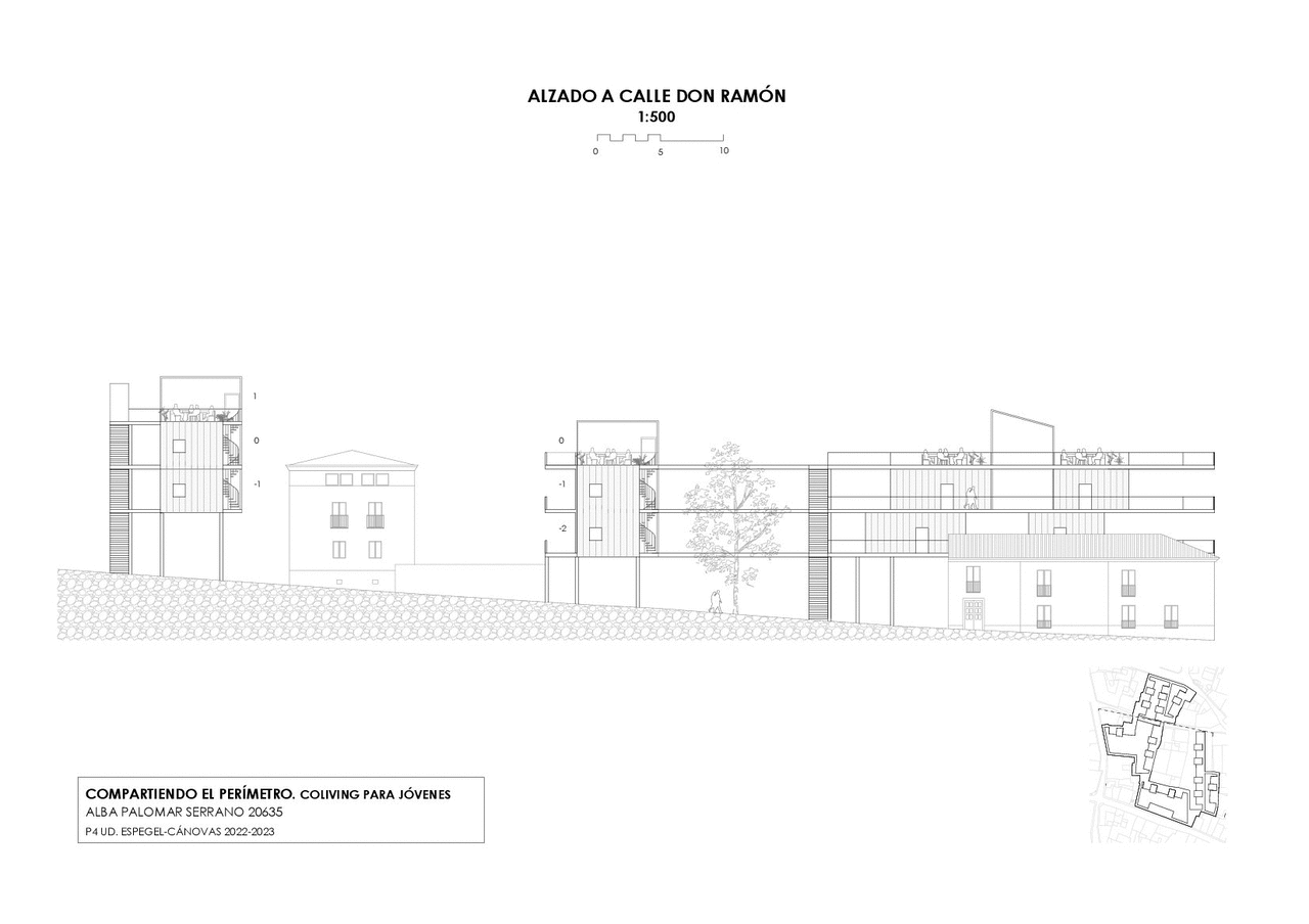 We are located within the walled historic center of the city of Avila. The project aims to create collective housing, trying to adapt to the surrounding pre-existences, as well as the identifying features of the area. Starting from the wall as a major sign of identity, the intervention intends to resonate with it. The initial premises of the project will therefore be to "walk" and "share", encouraging young users to integrate these actions into their daily lives.