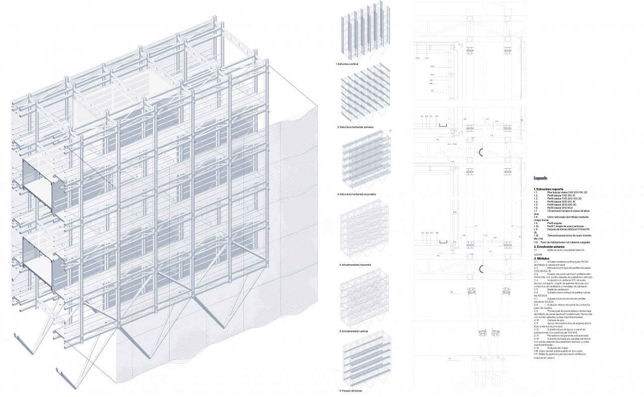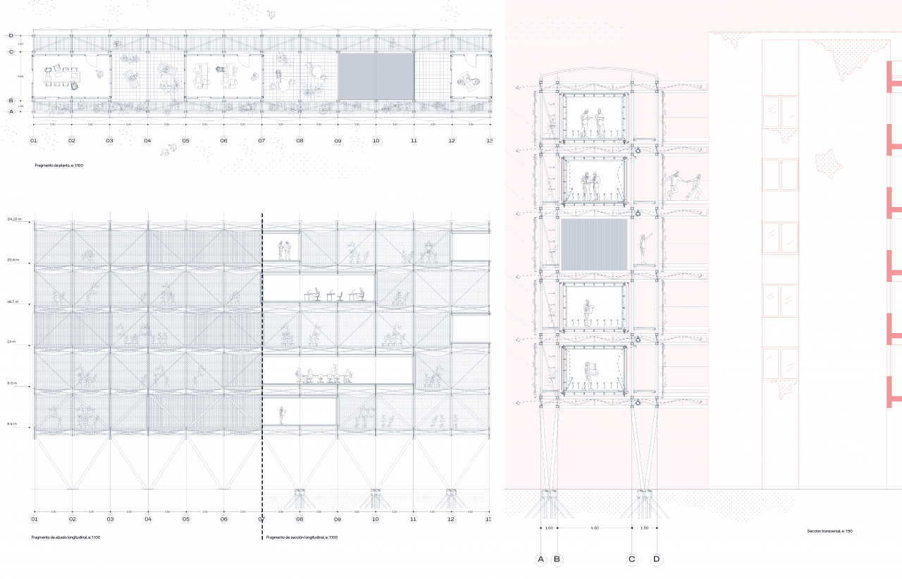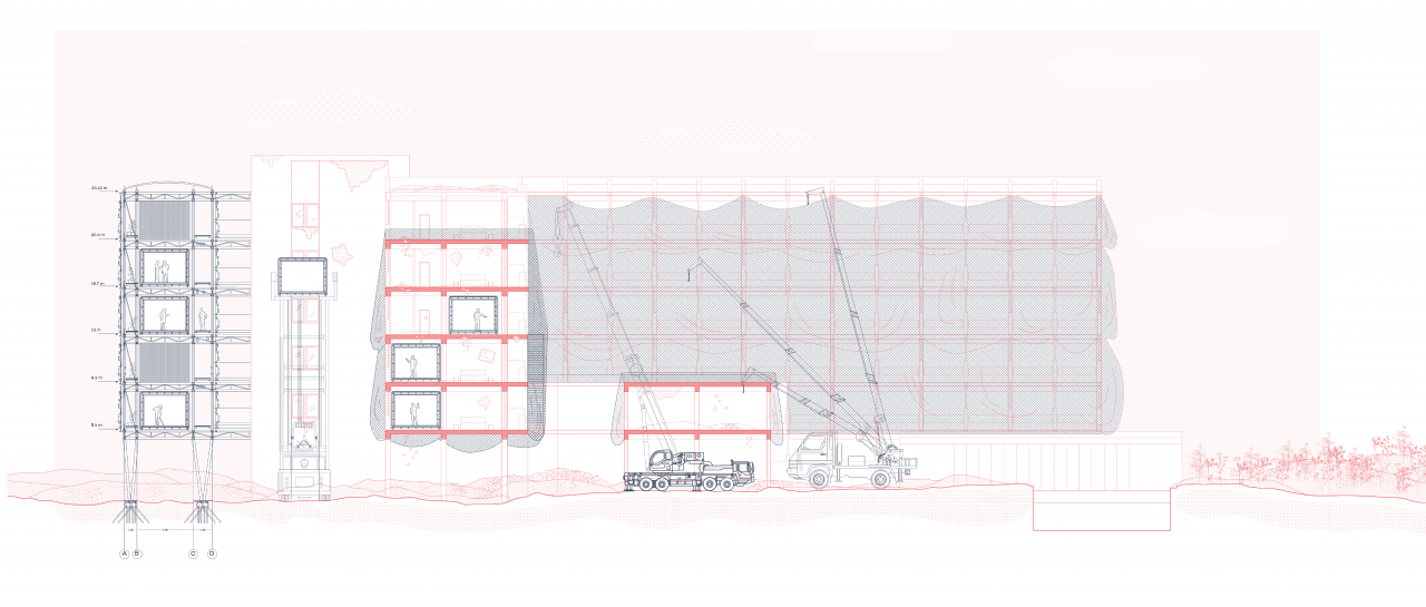 Si miramos de nuevo frente al hotel, nos topamos con una pantalla de andamios que nos camufla la visión de lo que hay detrás. Se vislumbran máquinas y grúas tras ella. Han comenzado las obras. Se trata de una estrecha pieza colocada estratégicamente frente al alzado principal del edificio, y arriostrada en los núcleos previamente reforzados del hotel. Una estructura metálica ligera, algo temporal que marcará el inicio de un cambio. Dentro, los trabajadores gozan de confort gracias a un doble espacio a través de materiales ligeros y desmontables.