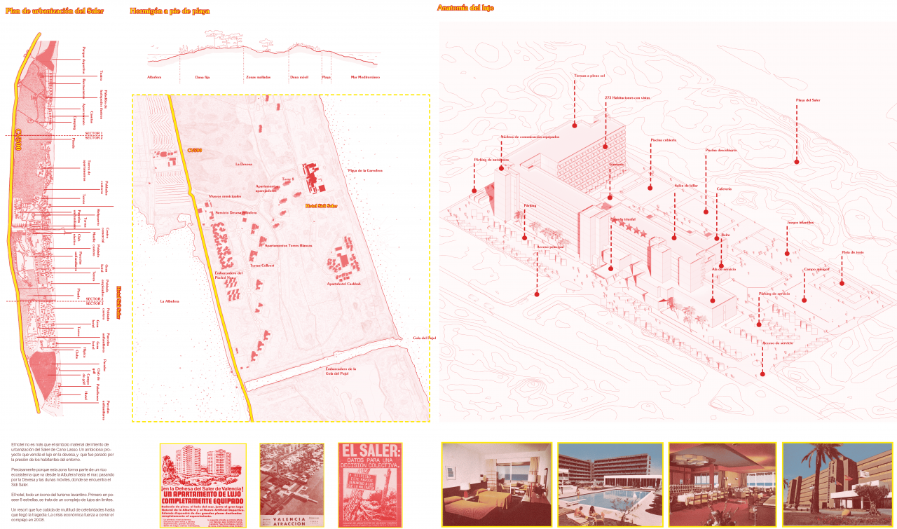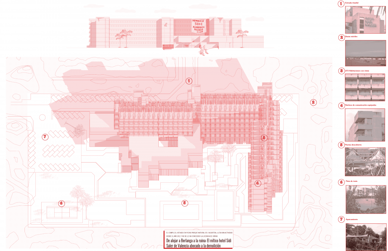Cuando alguien decide pasear hoy frente al hotel, se encontrará con un recinto totalmente cerrado al público. Falsos techos desconchados o una vegetación que coloniza el lugar, genera un cierto anhelo de saber qué ocurre dentro. Junto a él, un grupo de trabajadores se dedica a sellar las dunas móviles de la costa. Si nos alejamos un poco lo entendemos mejor. El hotel aparece al fondo instalado en medio del cordón dunar. Este icono se ha acabado convirtiendo sin pretenderlo en un oponente a la regeneración dunar, que permitiría evitar la recesión de las playas, lo que preocupa cada vez más a los vecinos del Saler. Mientras. el futuro del hotel está cada vez más abocado a una demolición total.
