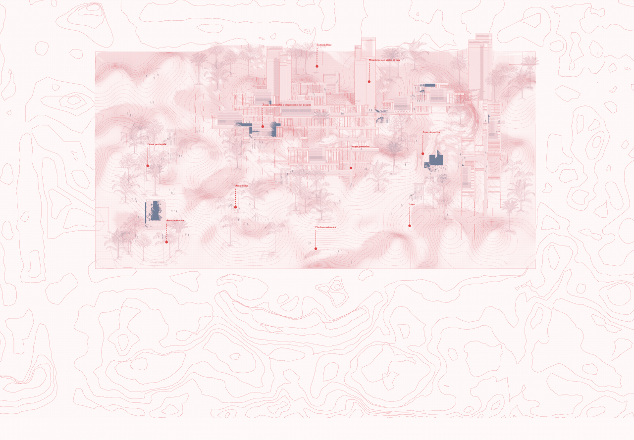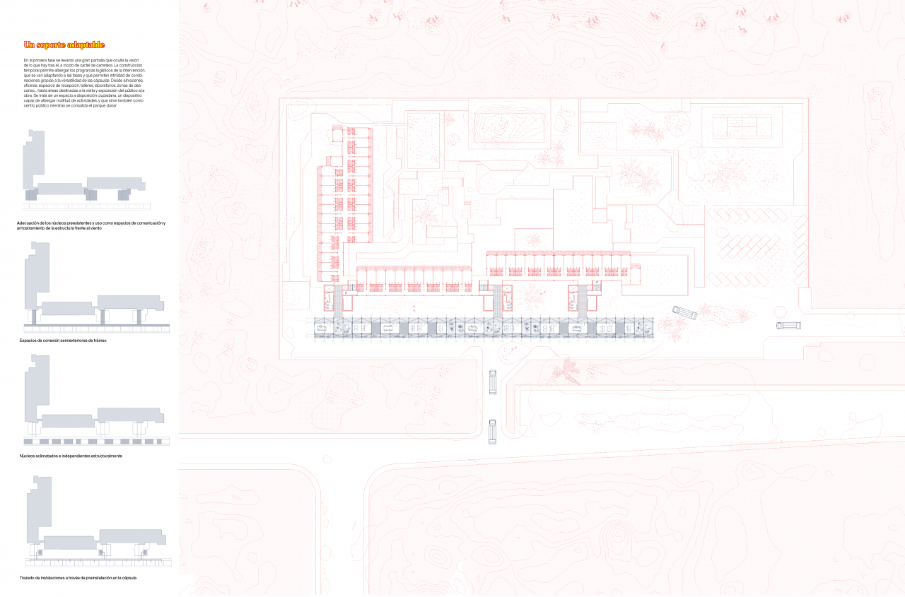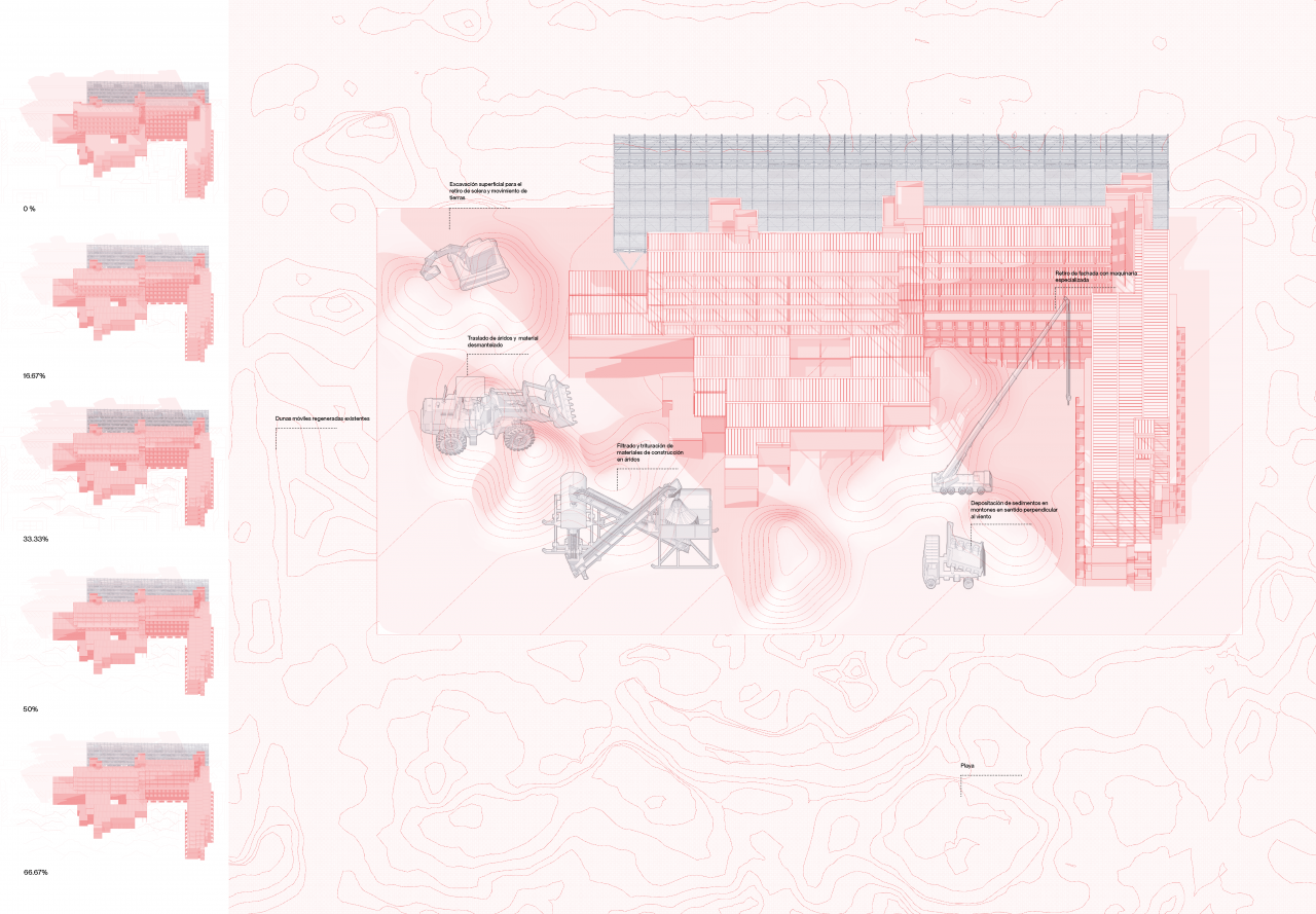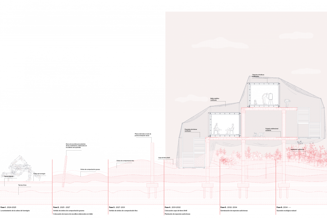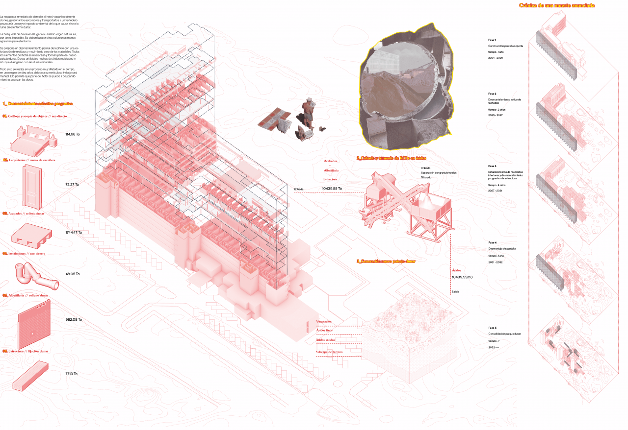 A la vez que el edificio decrece, la topografía se desarrolla, generando un jardín en movimiento entre los áridos ya depositados y la vegetación espontánea que coloniza el lugar, que se asienta entre el último trazo del hotel. Con el fin de las obras, la pantalla que albergaba los programas logísticos desaparece, reutilizando la estructura para el recorrido permanente. Tras ella, aparece un nuevo parque de dunas entre las huellas del hotel. Dunas que se conforman de los mismos restos de los materiales desmantelados.