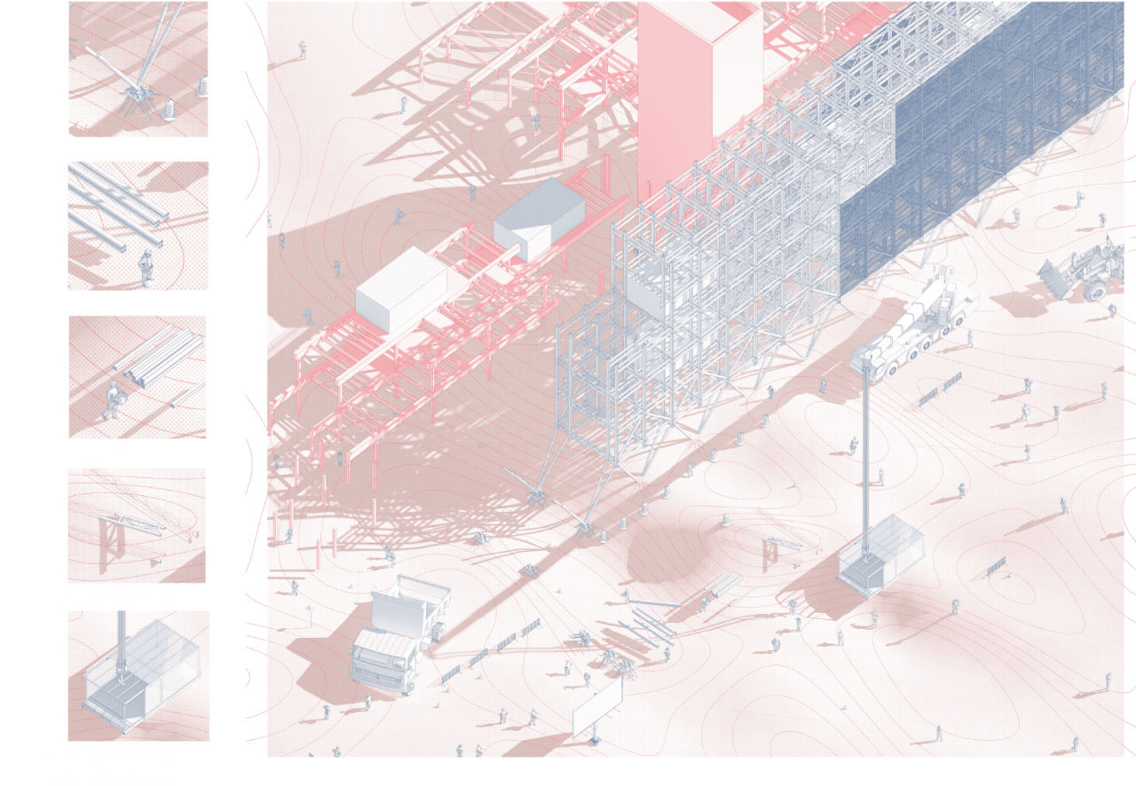 Mientras que desde fuera el lugar se percibe como algo estático, dentro nos encontramos con un paisaje en movimiento. La pantalla se inserta y con ella, comienzan la primera parte de los trabajos de desmantelamiento con maquinaria pesada, como el retiro de las fachadas del edificio. Con el área asegurada, comienza una fase de acceso al público en el recinto del hotel coronado por grandes máquinas. Para ello se cuenta con el traslado progresivo de las cápsulas de la pantalla, que se insertan en el interior del hotel y que son desplazadas a medida que avanza el desmantelamiento de la estructura.