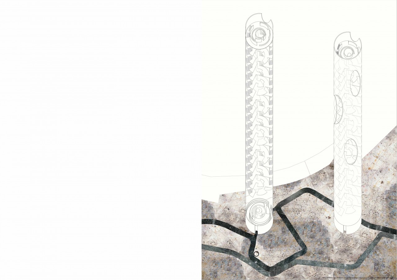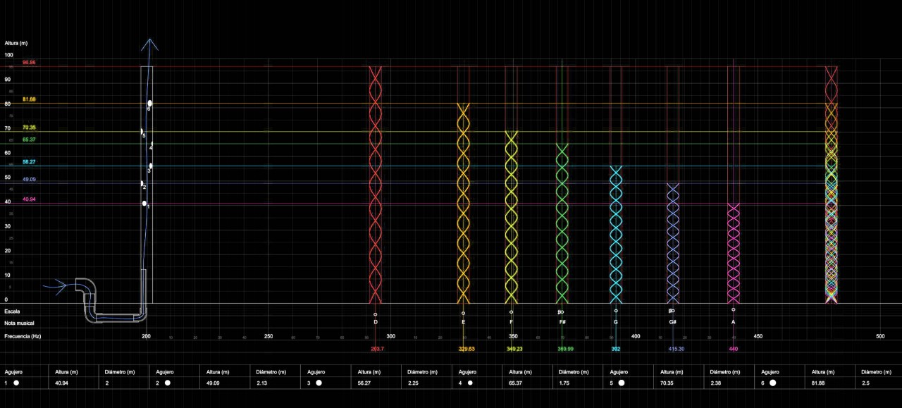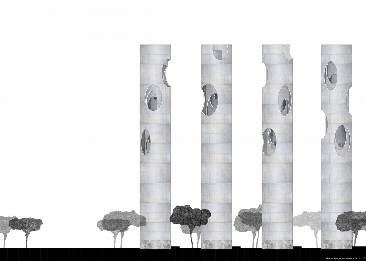 Madrid, 2018. El Faro de Moncloa is going to be replaced by a new tower, based on the idea of air. The project is inspired by how the air in movement is transformed into sound inside a flute. It is proposed a cylindrical tower, which plan is organised between different non-concentric circules. Each resultant cylinder is perforated with circular holes that produce sound when the air passes through them. Holes from different cylinders do not coincide exactly, they are slightly overlapped. The tower is built with cylindrical steel trusses recoated with steel sheets, supported by a concrete basement.