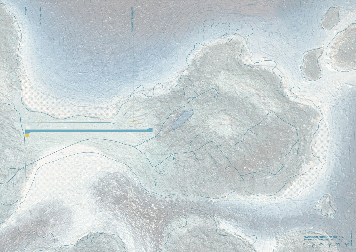 As it is shown, the project uses the line as main shape. It is present in its design and construction. With small combinations of lines, a huge straight line which coexists with the runway has been created at Donegal’s grassland.