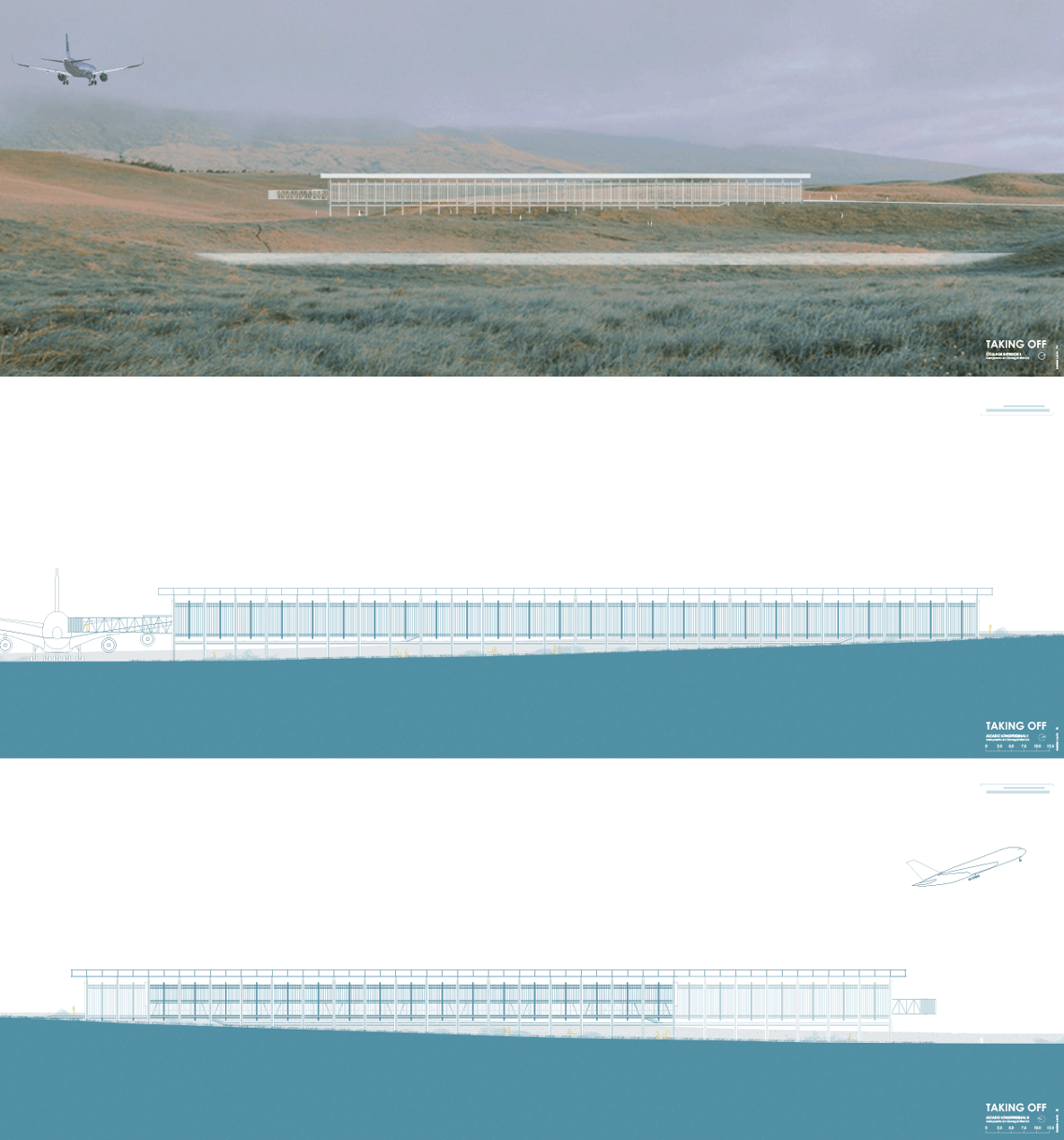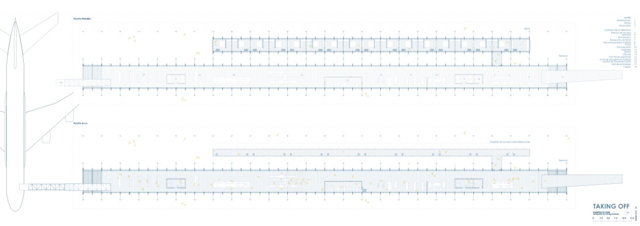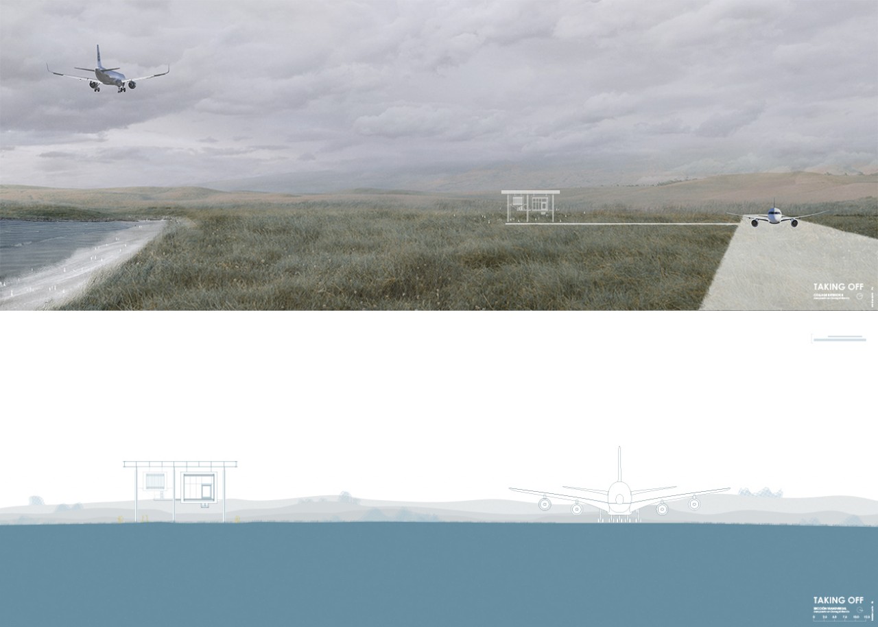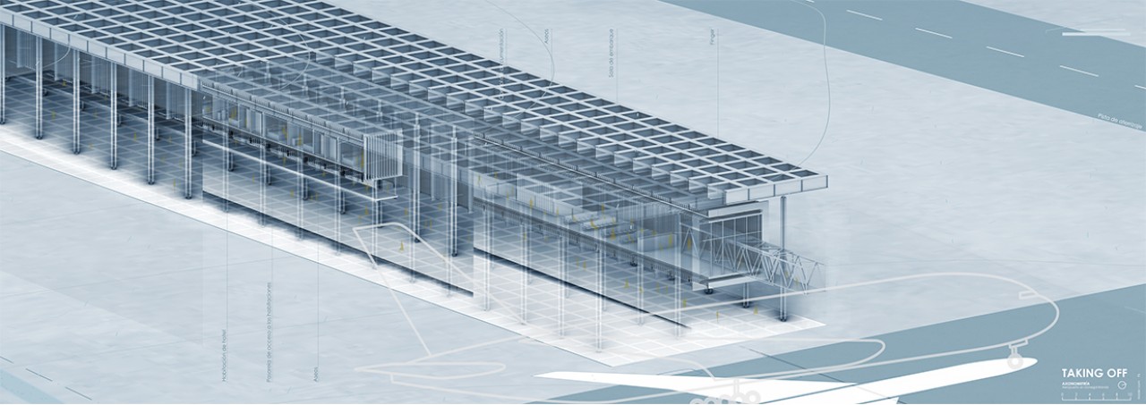The project is located at the end of that huge straight line and parallel to it. It consists of a modular structure formed by three rows of cruciform pillars that hold a big metal roof. There are two longitudinal pieces hanging from it maintaining the relation between the runway and the sea.