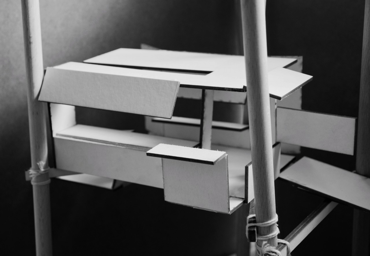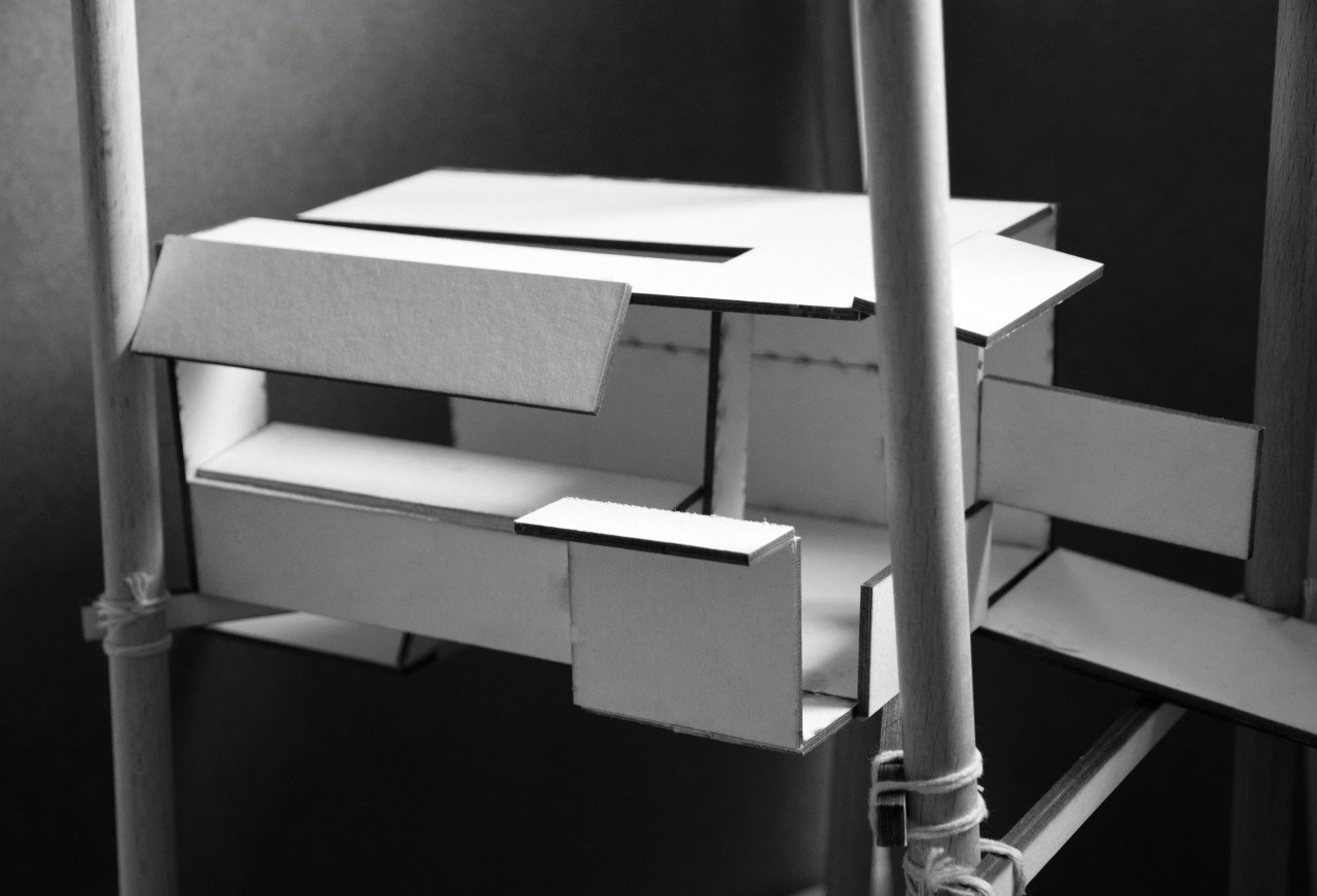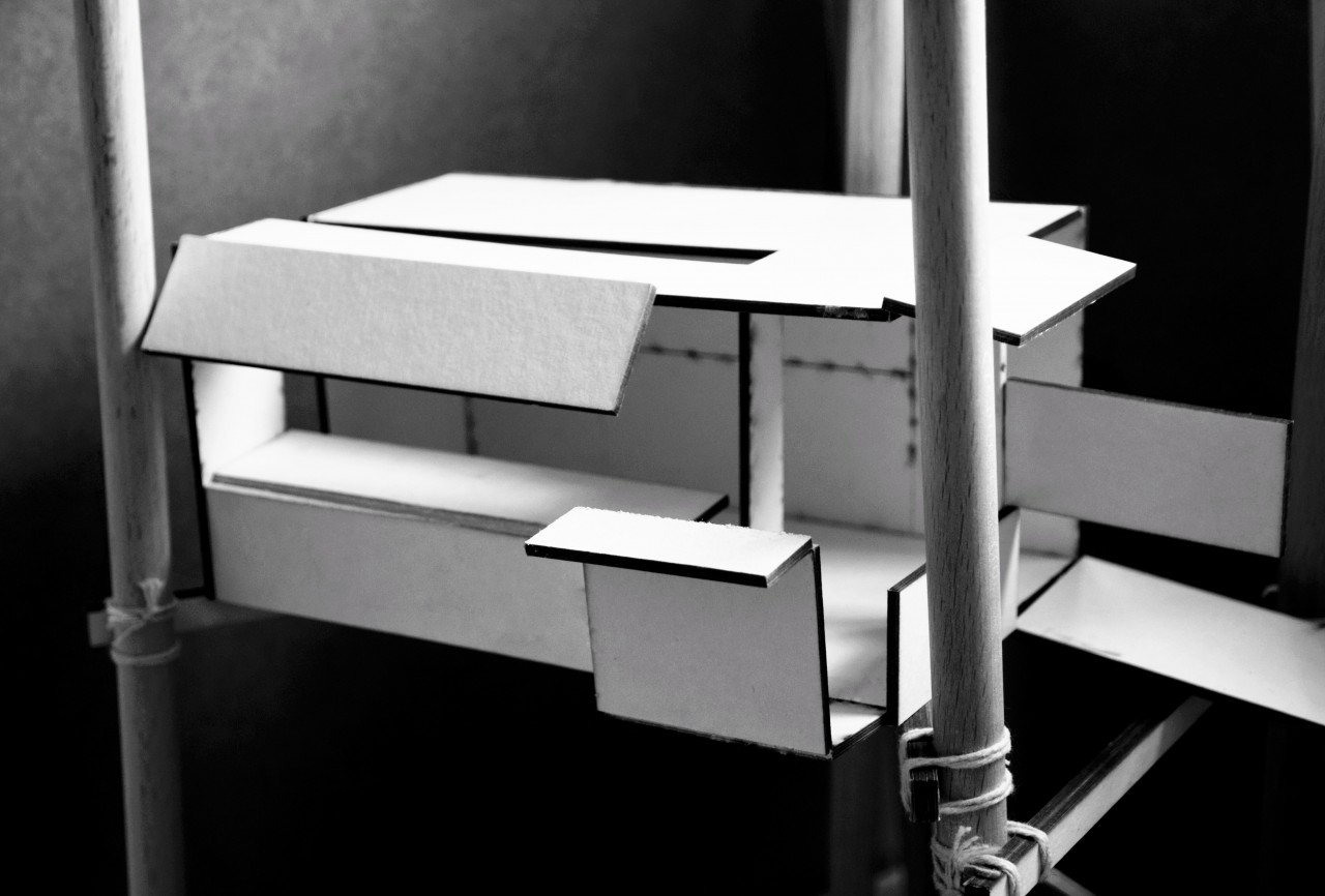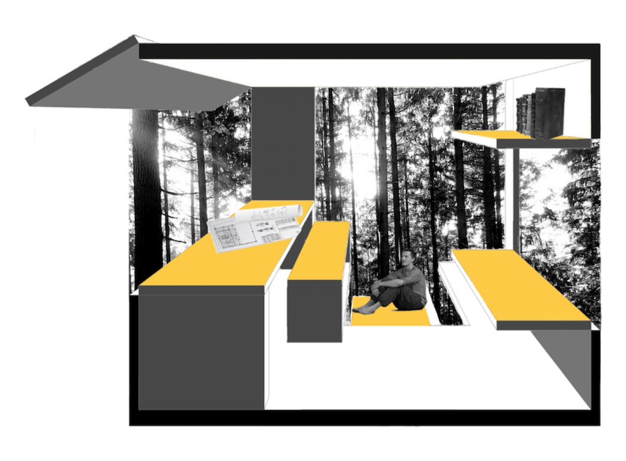 My project is about the extension based on an existing house 'The Box' of Ralph Erskine in Sweden. The existing house is located in a forest. It has only a kitchen, a living room, a storage area for firewood and a porch. The architect, as well as the owner of the house only work at a small corner in the house, so I decided to do a studio for the extension. The studio is a tree house, and the communication between the existing house and the studio is a serie of ramps that leads people from the house to the studio. The studio is made of wood and it is very light. What's more, it is transformable. It is introvert and completely closed at the beginning but it can open little by little until it turns into a extrovert open box that is facing to the view. The sustaining elements are beams which support the studio and the ramps and they are connected from one tree to another.