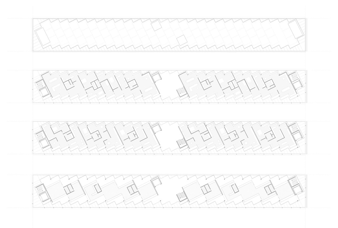 Within the 100x10x10 meter parallelepiped, the dwellings are planned in a saw-tooth layout, which generates façades open to the four cardinal points. In addition, a certain degree of privacy is achieved both in the deep terrace that continues open to the southwest and in the balconies facing northeast. There will be five housing typologies. These will be modular thanks to the layout of the living spaces. They will seek to make the best use of space by avoiding corridors within them.