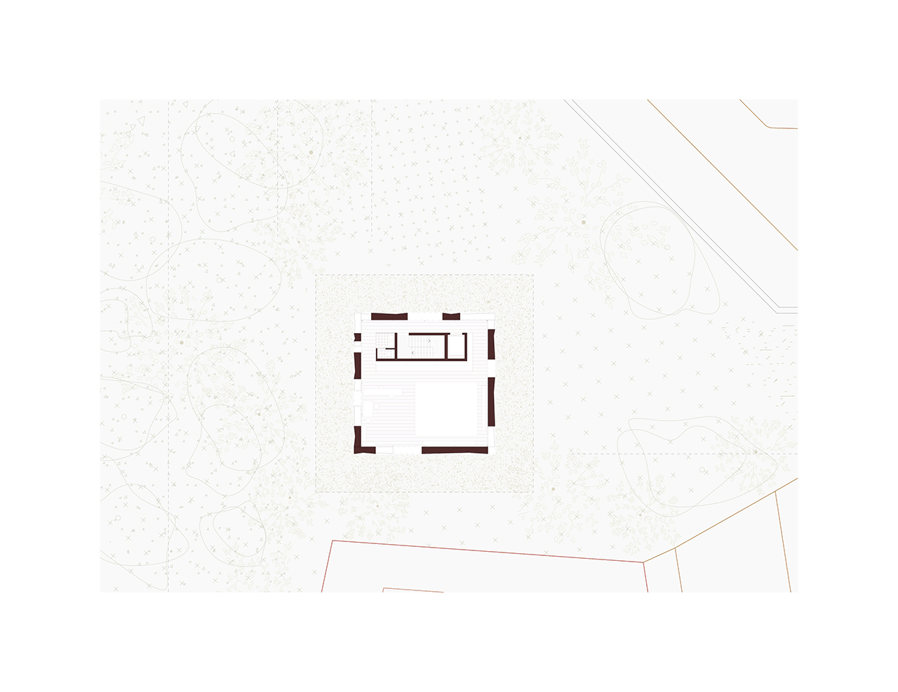 The building is arranged diagonally at the northern end of the plot, creating a triangular square and acting as a barrier between it and the extensive park that occupies most of the plot.