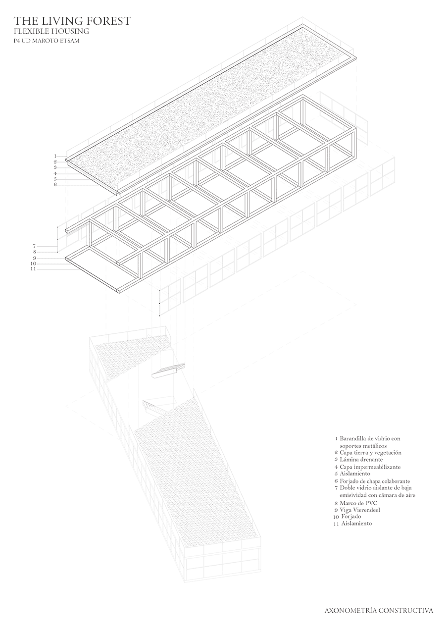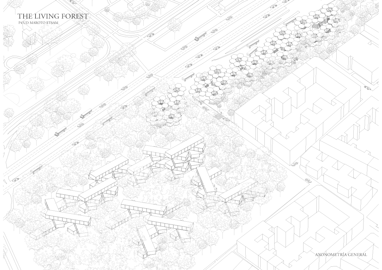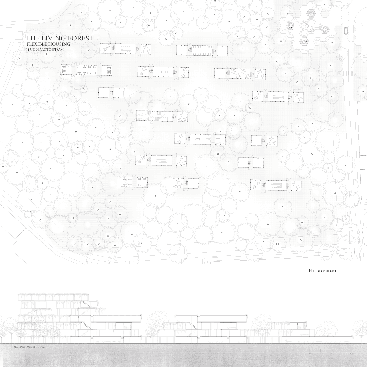 The project connects a public area with a residential zone through a deciduous tree forest that naturally regulates the climate. In the residential area, volumes intersect at different heights, creating large openings resolved with Vierendeel beams.
