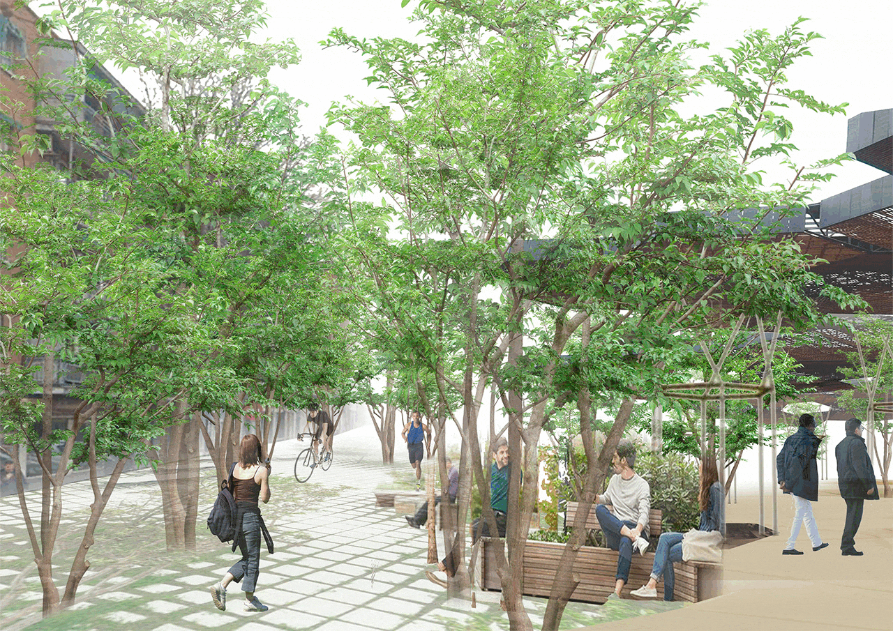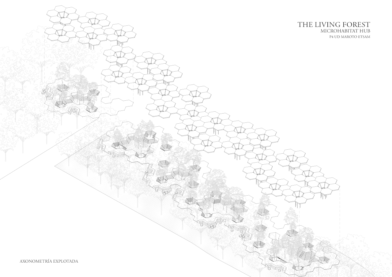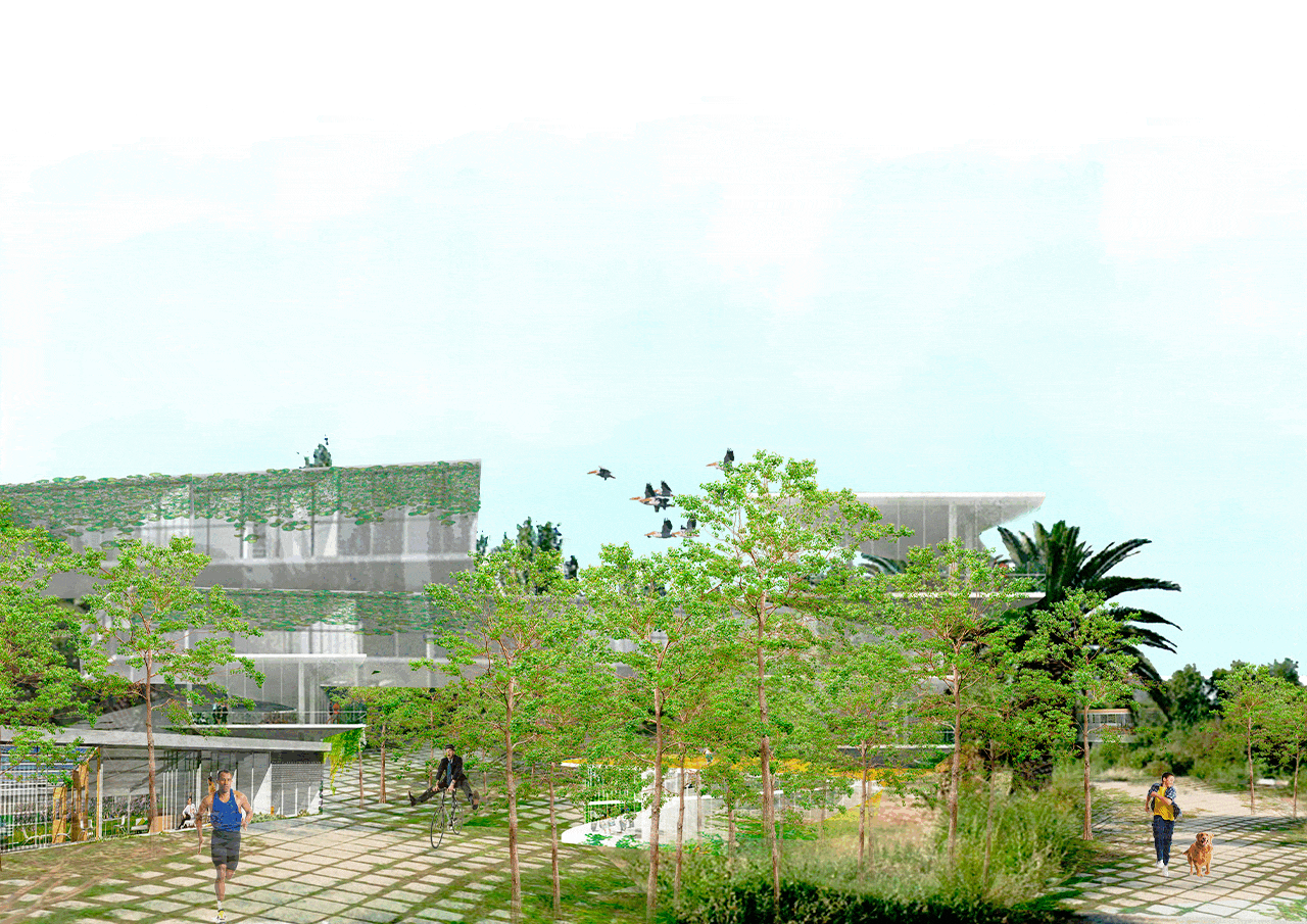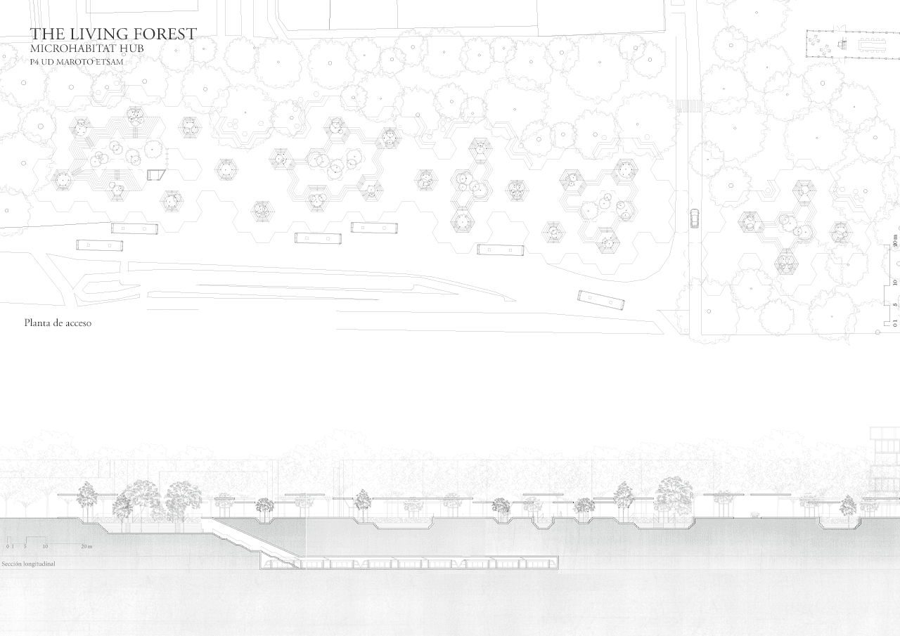 The project connects a public area with a residential zone through a deciduous tree forest that naturally regulates the climate. In the residential area, volumes intersect at different heights, creating large openings resolved with Vierendeel beams.