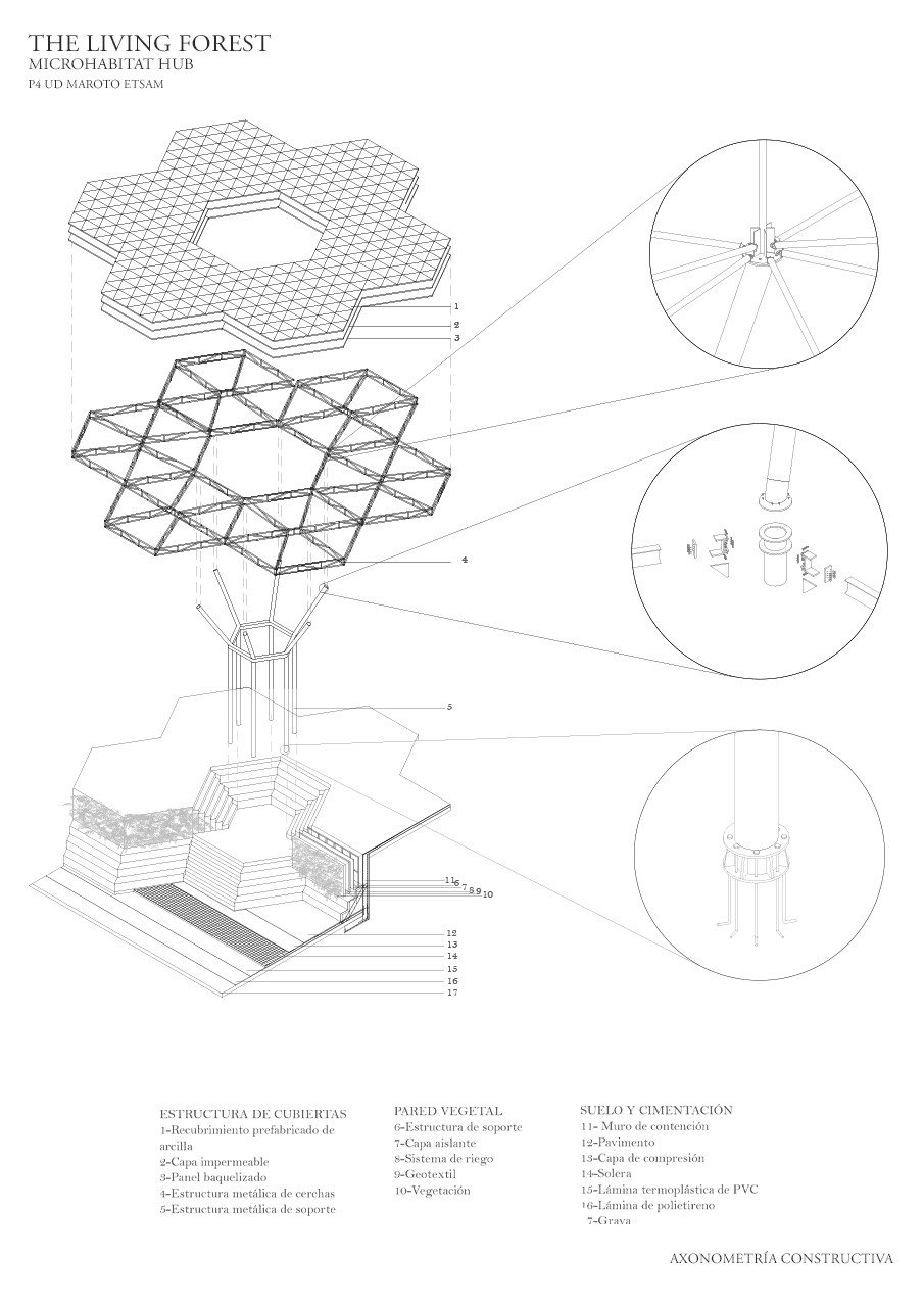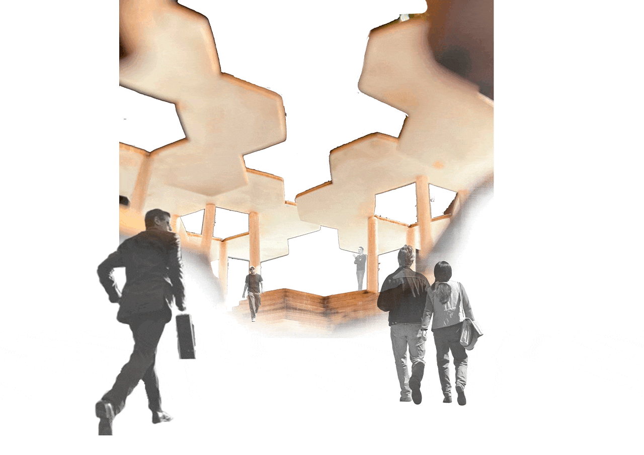 The outdoor public space utilizes terrain slopes and roofs that define spaces, including waiting areas for buses and metro. The hexagonal shape creates recesses that improve circulation and connect with a pedestrian path leading to the residences. Urban furniture, both fixed and mobile, is designed with weight to prevent theft.