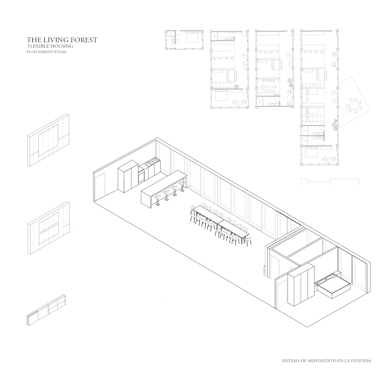 The housing units are arranged in narrow volumes allowing flexible interior layouts using movable partitions and foldable furniture. Some units function as temporary housing, consisting only of a bedroom and bathroom.