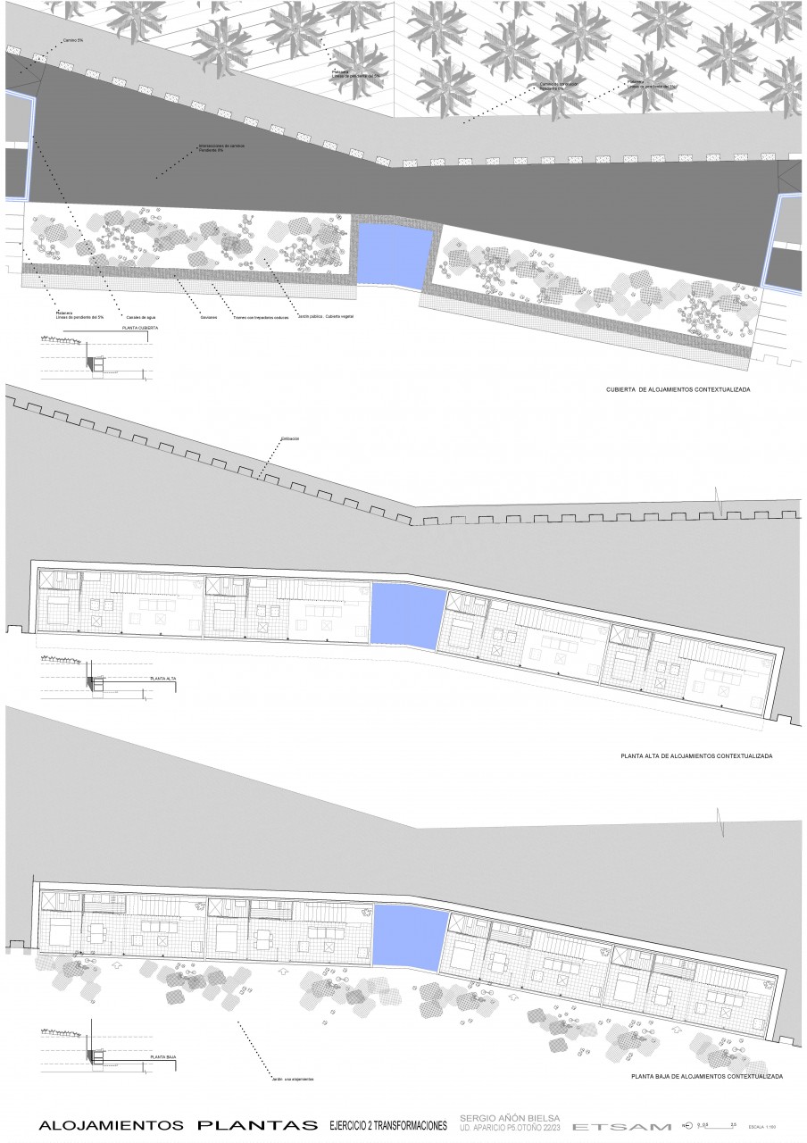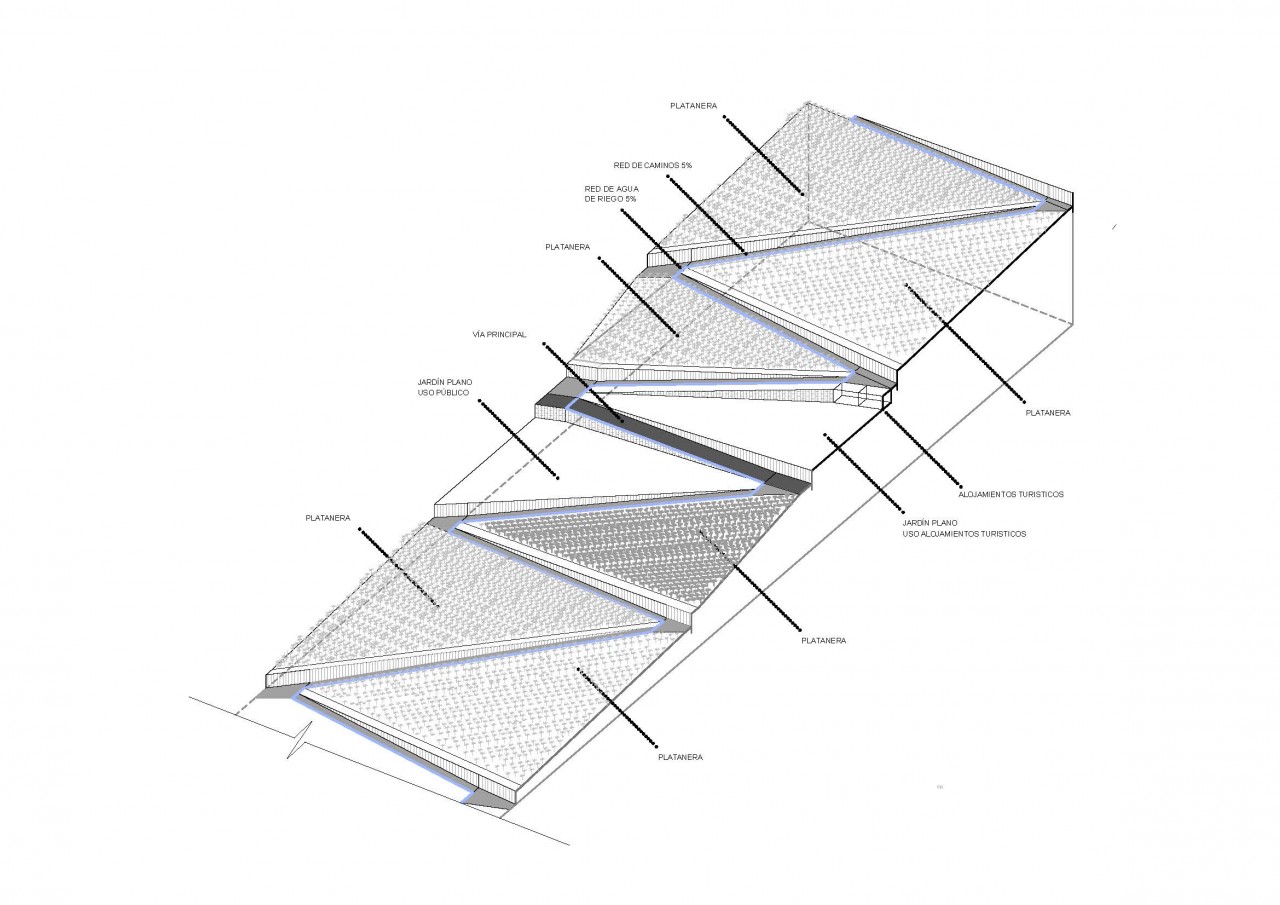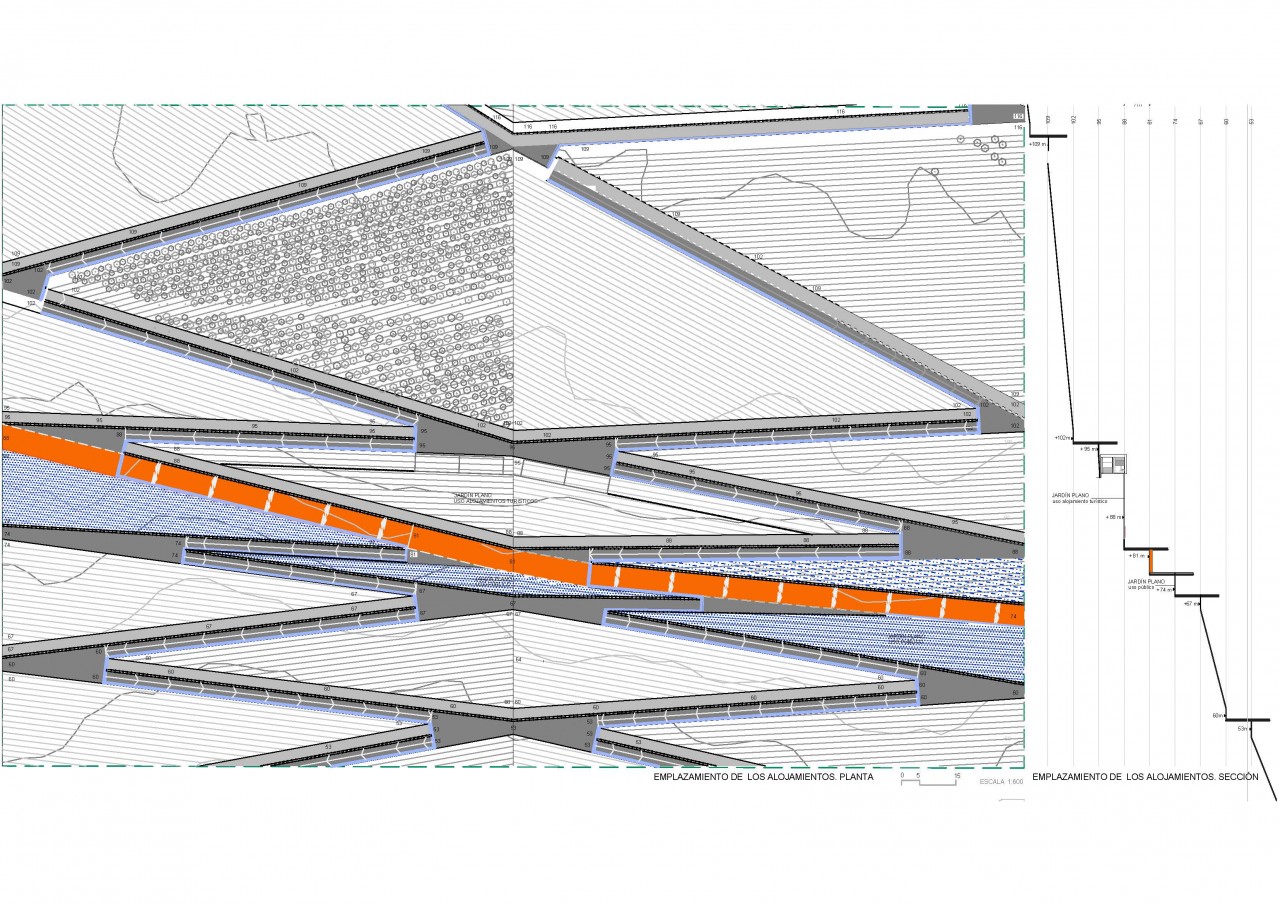 The houses follow the Villa Adriana system. It solves a large slope by means of a habitable wall that serves as earth containment, through timbering, to create a horizontal topography in front. Thanks to this system, the houses are totally hidden in plan what helps to create wide spaces that can be walked on top of them. In this way, the landscape determines the house and the house builds the landscape.