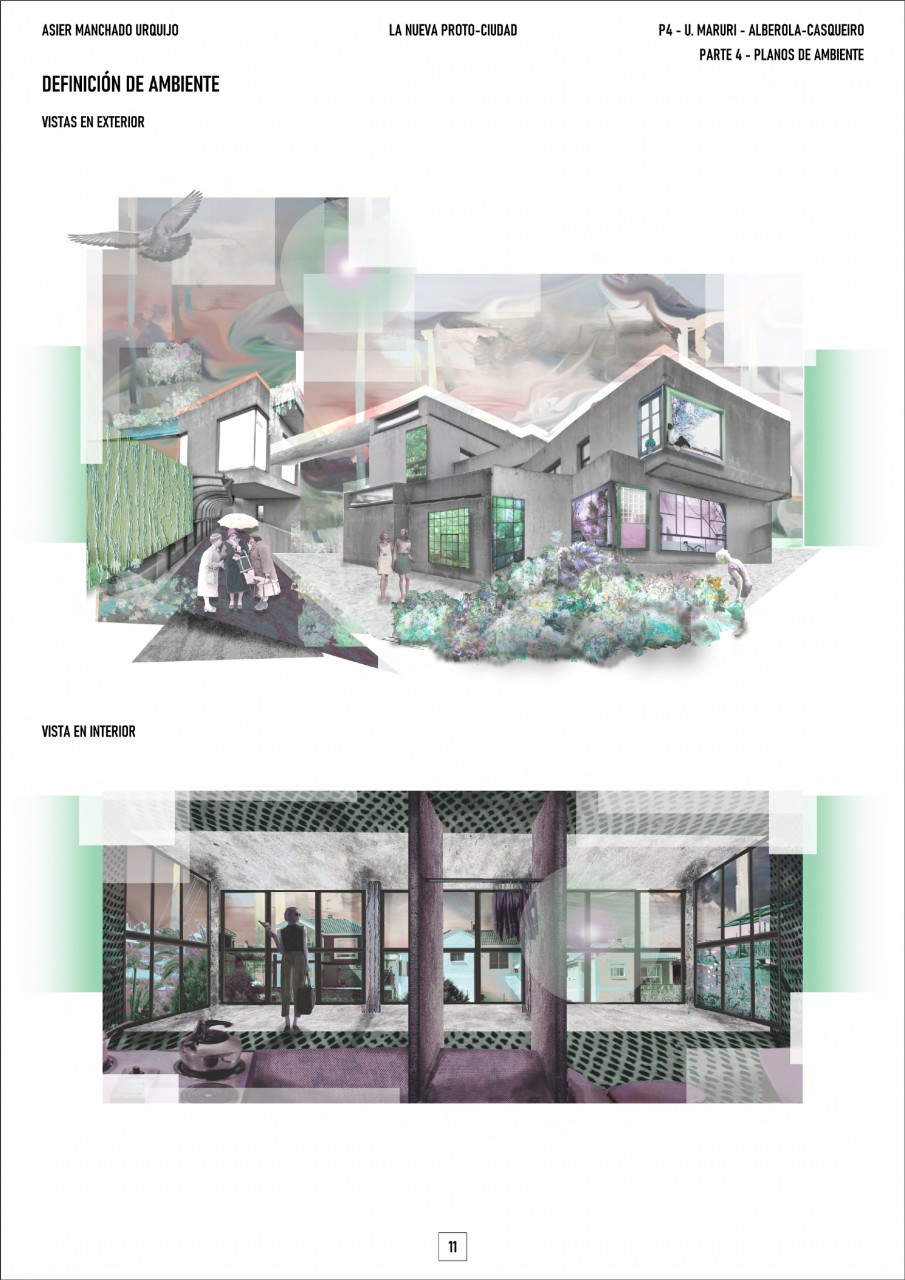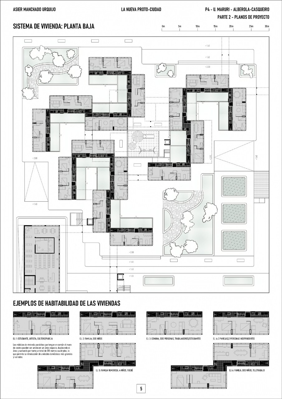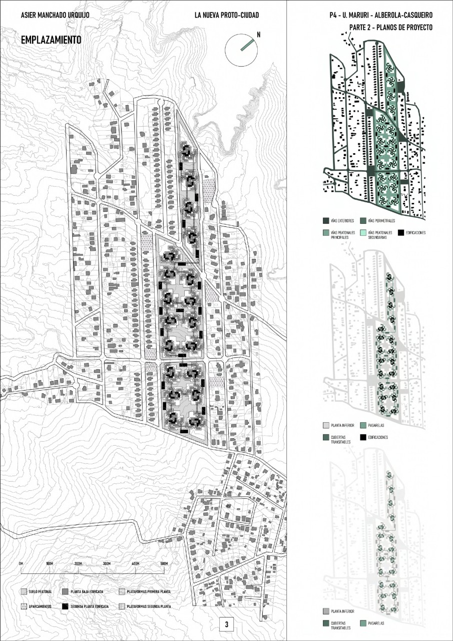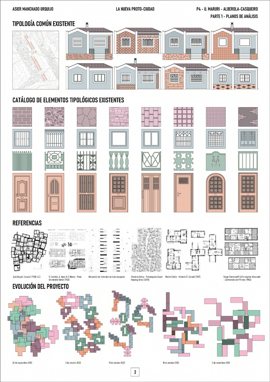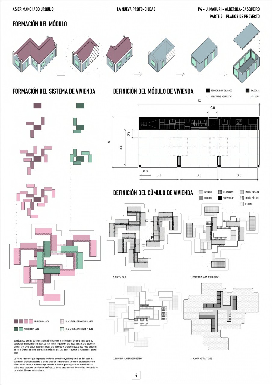 The New Proto-City takes the neolithic settlement of Çatalhöyük and reinvents its principles to accommodate it within the suburbs of the quiet Manchego town of Palomeque. This is done through the emulation of a housing type already present in the area, where the same house is repeated with variations in windows, doors, etc.