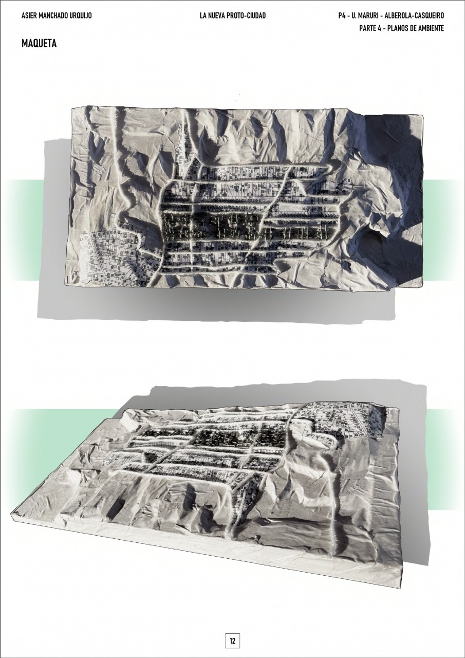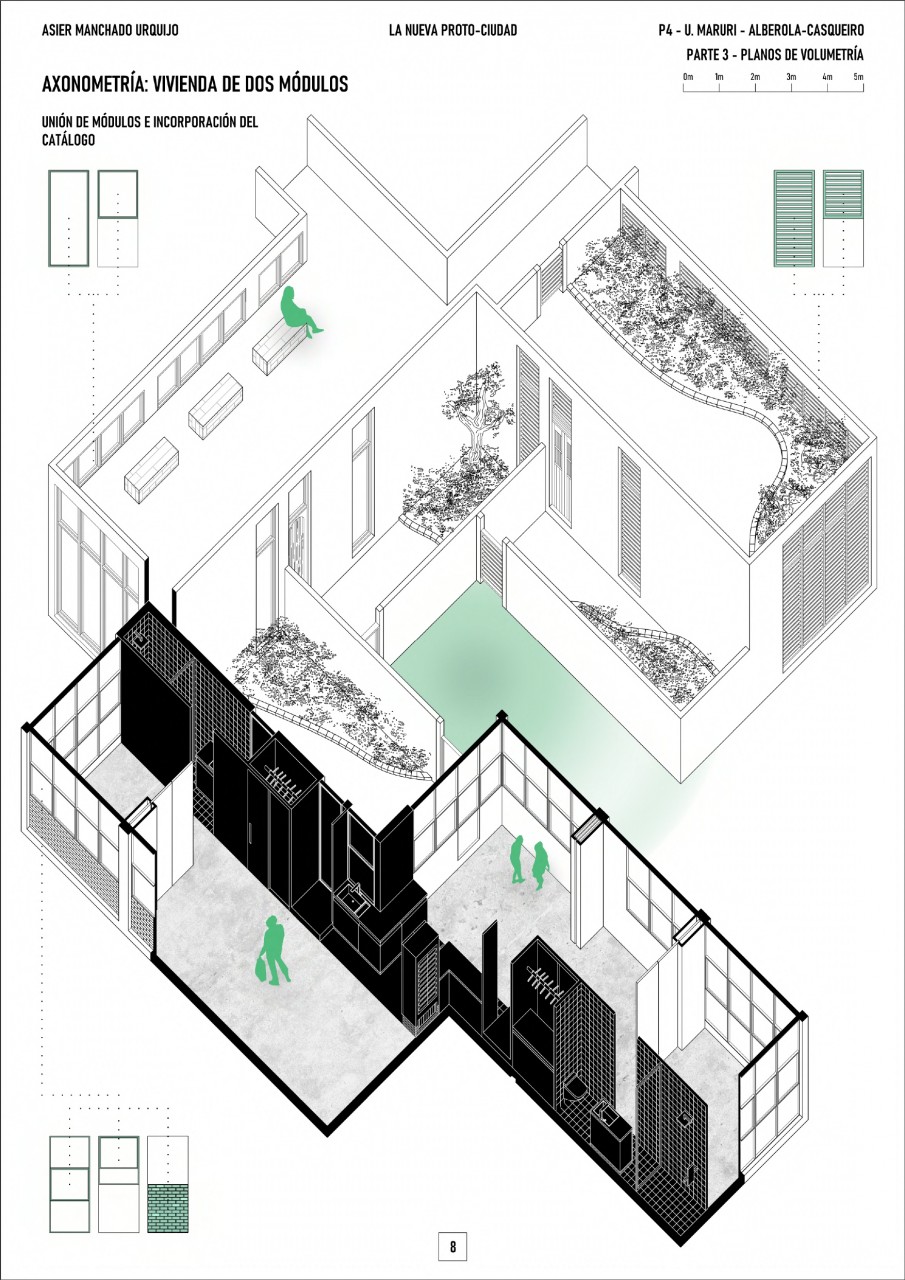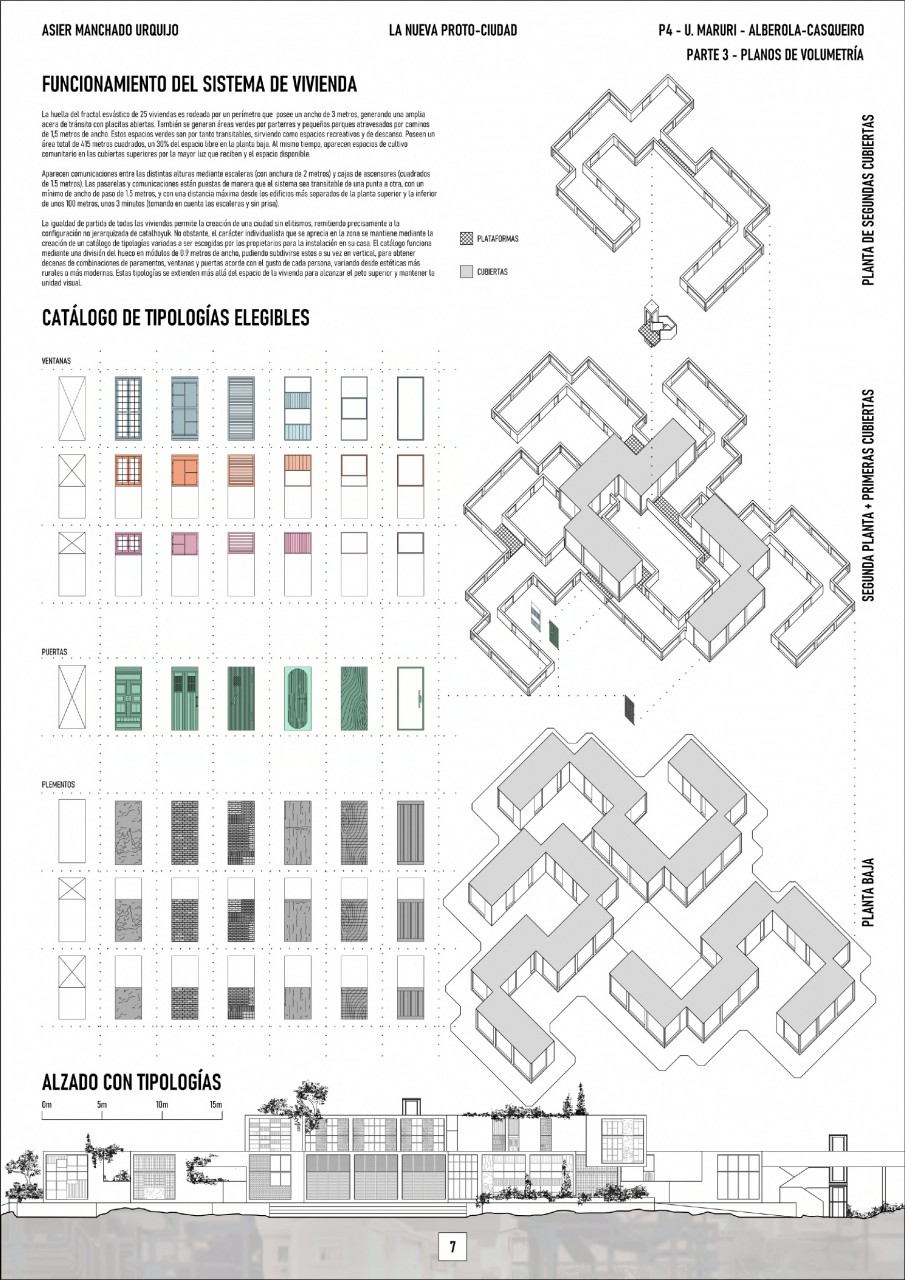This same house is taken through an abstraction process to obtain a 60 square meter residential module, with a built-in service wall and movable partitions that free up the maximum space possible. Once the modulus is defined, the cumulus is created through the jointing of 25 of them across two floors and within the geometrical rules of fractals. These cumuli are raised over podiums and spread throughout the middle area of the suburbs, accompanied by a system of streets in the lower level and raised platforms in the roof decks, which tie in with the neolithic reference. The system is completed with a variety of public buildings, green areas and street furniture, as well as the remodeling of surrounding roads, intersection and parking spaces.