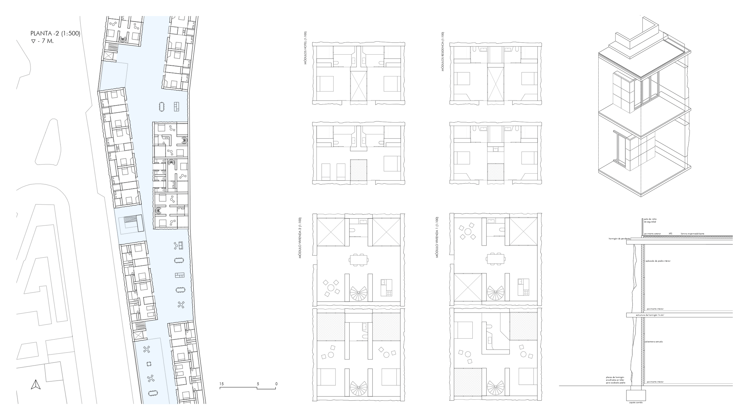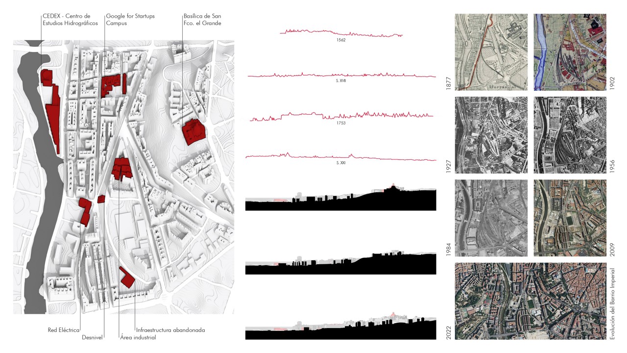 Today this nature has been lost, leaving numerous urban voids. The project is located in the center of the neighborhood acting as a nexus and resolving a 7 meters difference in level.