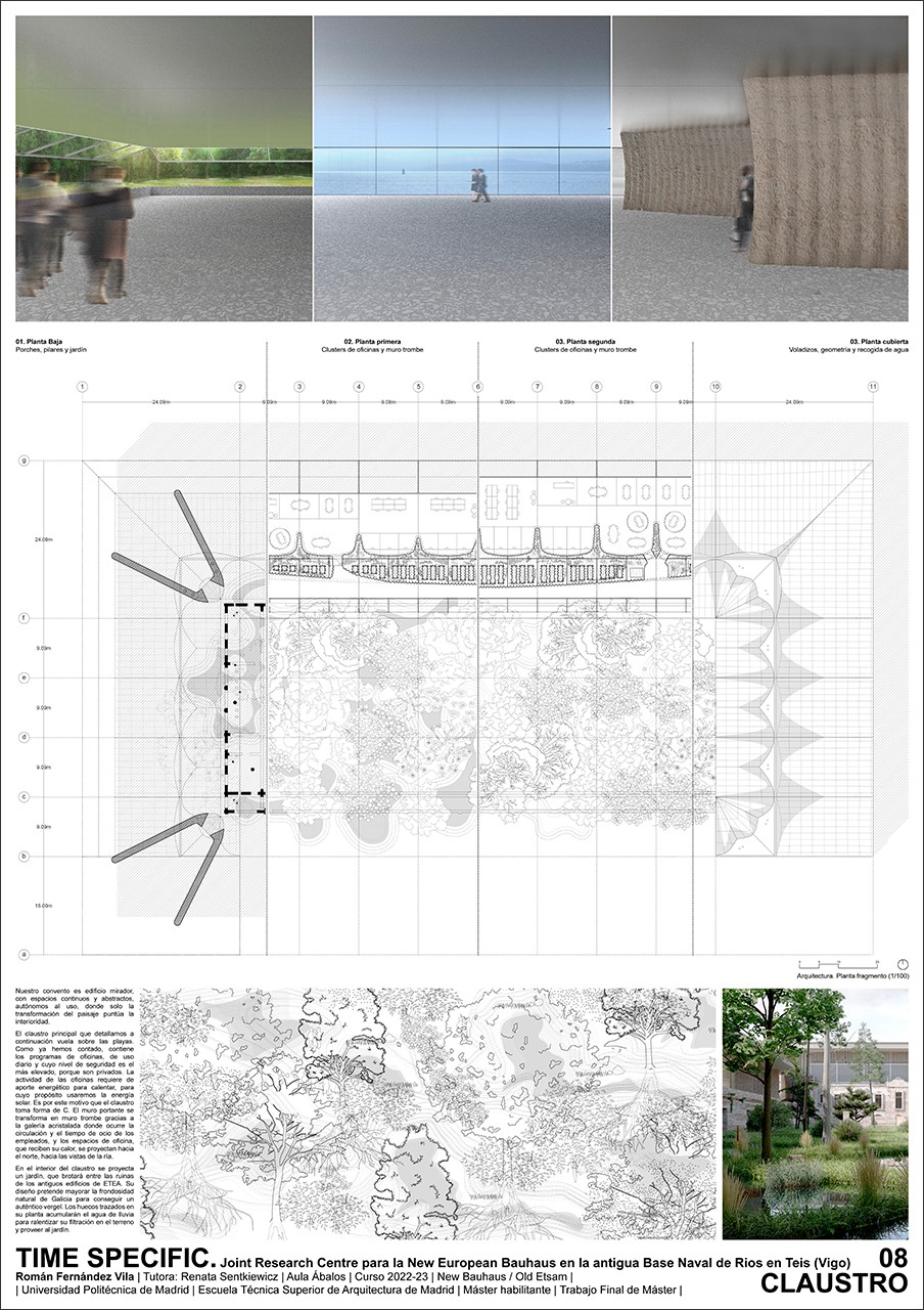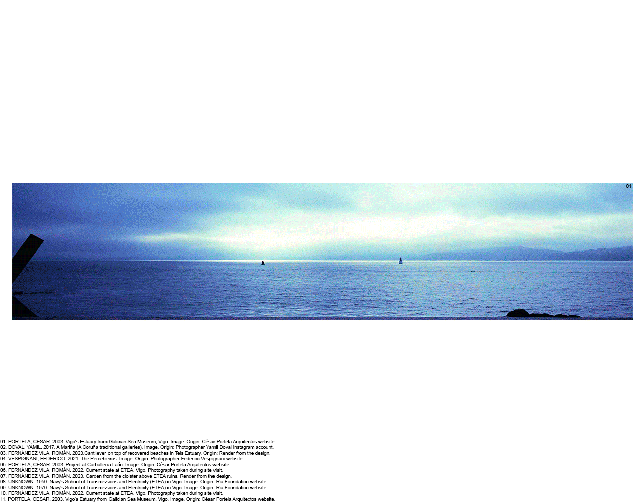 Now let’s go back to the New Bauhaus, which aims to deploy a European network of knowledge. The Union proposes integration, sustainability, and new beauty as the concepts of the European architectural brand it pursues. The question about European identity construction underlies this framework. How does a European body land in a natural, suburban, and industrial setting like the Vigo’s Estuary? In the face of climate change and as the spearhead of the Green Deal, how does it insert into Galician climate thermodynamics? How do we establish the institution of the future on the ruins of its predecessor?