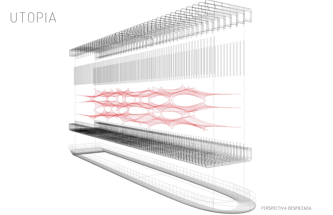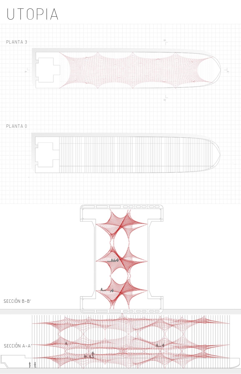 Like in the previous project, the second one follows the idea of lightness, being an intervention inside a ship. This project is based on a huge mesh held by lineally arranged porticos, that are part of the preexisting structure of the ship. The feeling of weightlessness and inestability that appear in the minds of every surfer take control of this new space giving the idea of being floating in the air.