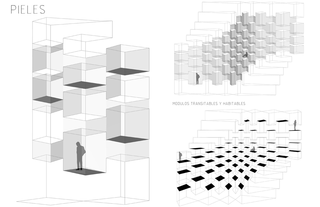 The first project is based in the creation of confinement cells, creating a big structure with a scaffold form. This scaffold holds the folds created in the previous phase of modulation. This is the way by which a series of habitable and accessible units are developed, overlapped over the façade of the fortress, and creating a hive which is light and difficult to make out. In this way we gain the idea of being in the air, in addition of following the geometry of the fortress when seen from above.