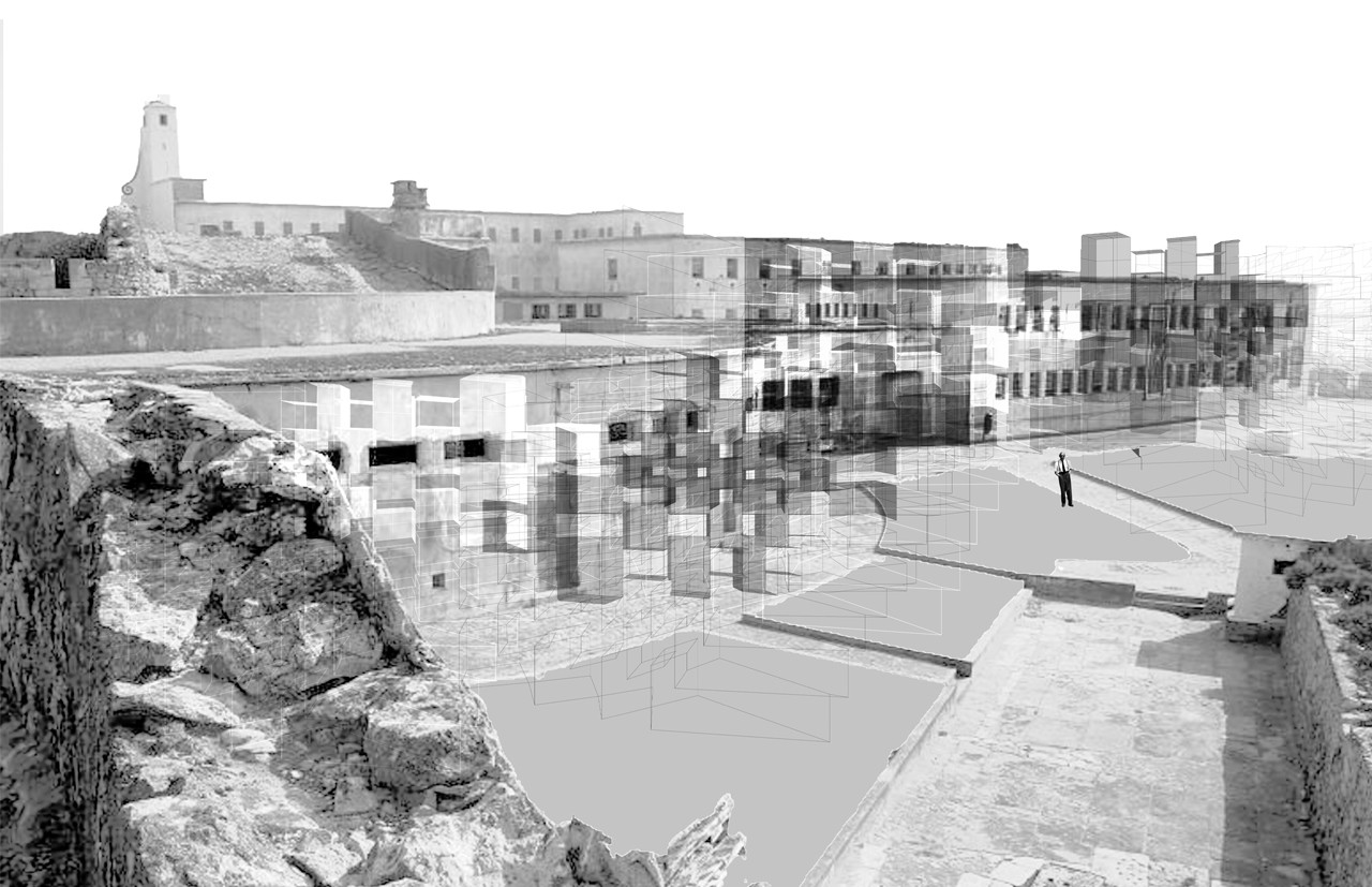 El primer proyecto se basa en la creación de células de confinamiento y reclusión, a través de la introducción de una gran estructura en forma de andamio que sostiene una piel de pliegues surgidos del trabajo previo de modulación con el cuadro. Aparecen así una serie de módulos habitables y transitables que se superpone en la fachada de la fortaleza, creando una gran colmena superligera y casi imperceptible que permite estar en el aire, y que en planta intenta seguir la geometría de la fortaleza.
