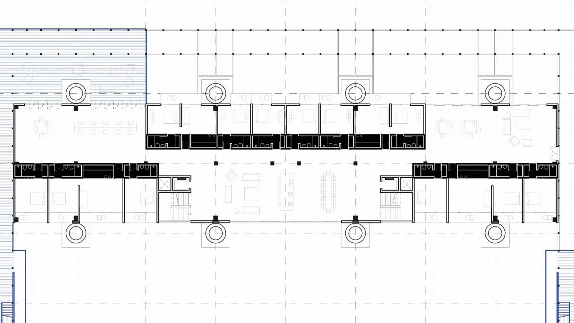 The building is organized through six access cores: four dedicated to private circulation, providing access to the residences, and two central cores that connect to the public section of the base. The other two cores, contained within the metal structure, allow movement between different levels of the building, granting access to the public area without entering the private section.