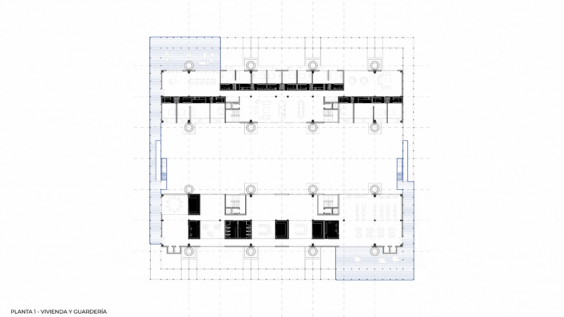 The housing within the project, in the four prisms, is organized into two main zones. One of these zones is dedicated to private spaces: bedrooms and personal use areas, while the other is for communal living, where the kitchen, dining room, and other meeting spaces are located, fostering social interaction.