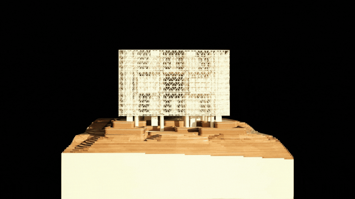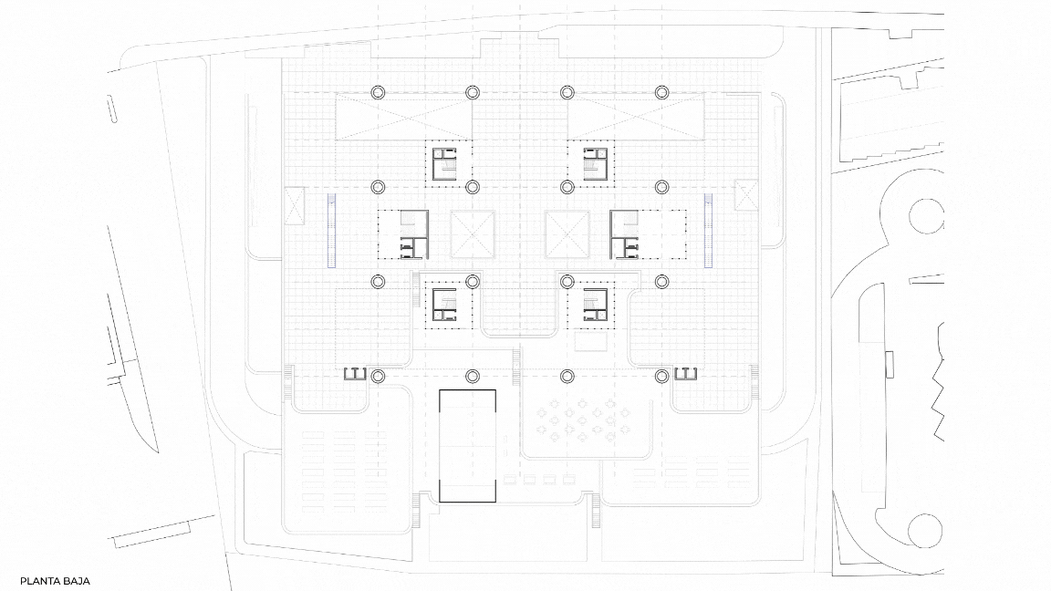 The original central communication core is removed, and the base is modified, creating courtyards and openings that allow light to reach spaces that were previously used as parking areas.
