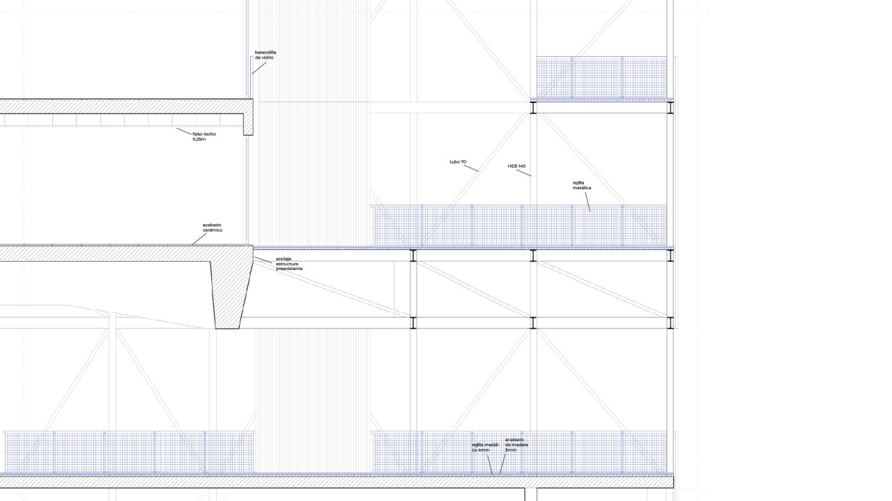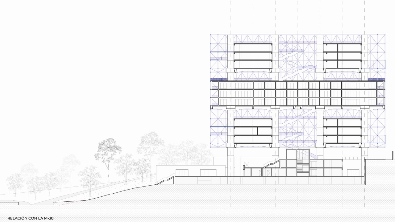 The main intervention of this project is a steel structure that wraps around the building, acting as a protective barrier against the M-30, isolating it from noise and pollution.