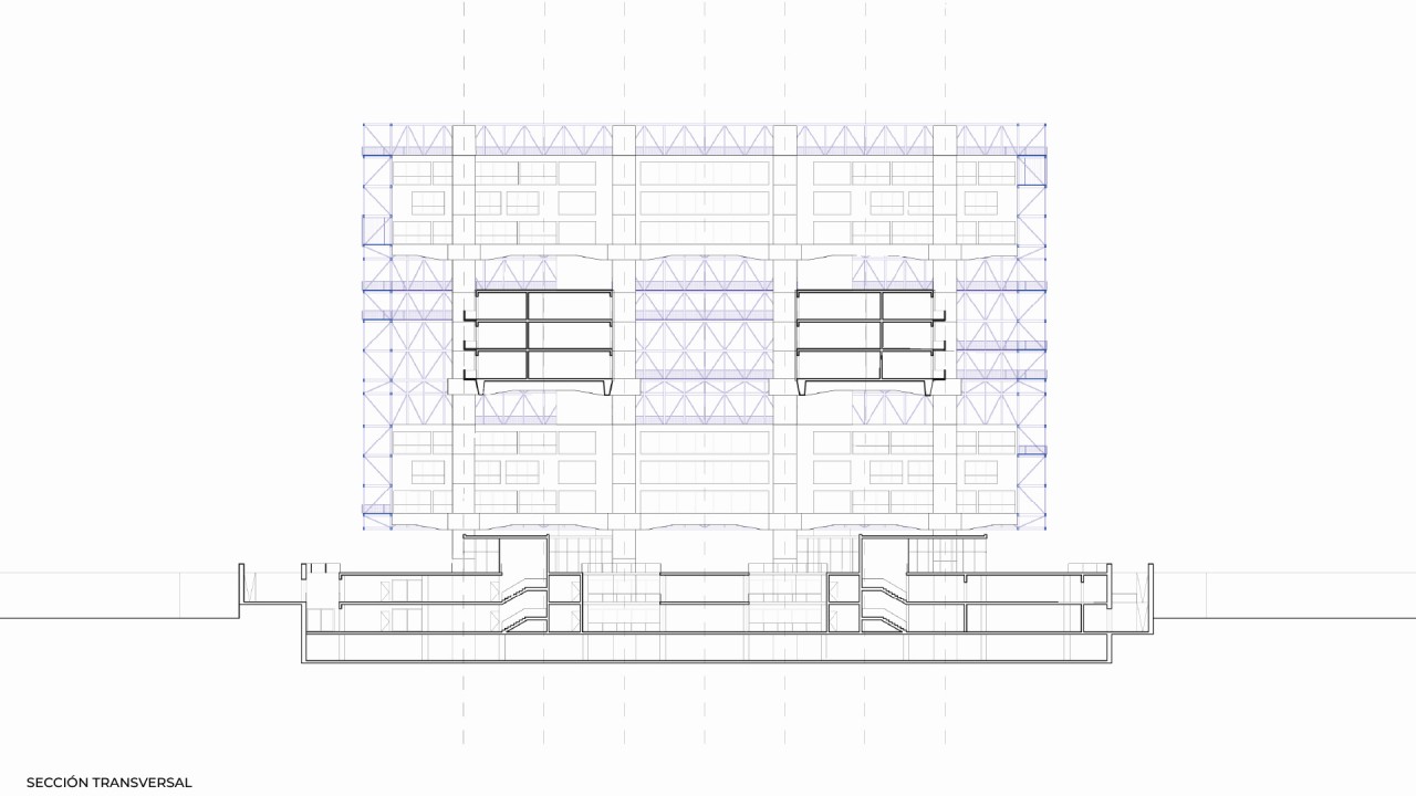 This lightweight and flexible structure functions as a double membrane that transforms the existing building, adapting it for residential and social use. It contains the external circulations, facilitates air flow, preserves the unique views, and complements the connection between the prisms. In addition to improving environmental quality, the new structure creates a direct relationship with the outside, always giving users access to rest and recreation areas.