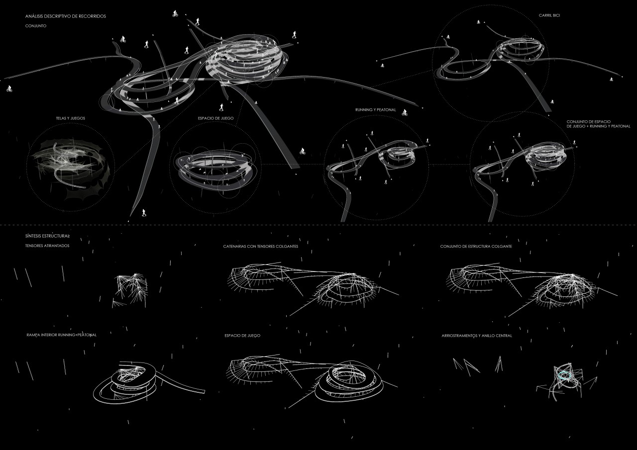 The Project is a continuation of the same routes of the pre-existing circulation of the cycle path and pedestrian lanes, it works as a bridge that involves a connection and link of both areas through a play space, an area of umbrary developed by its spiral envelope adapted to the environment of action, branching on both sides of the river. The project is about not a building, but an abstract piece of great lightness that gives value to the river and the environment in which it is located.
