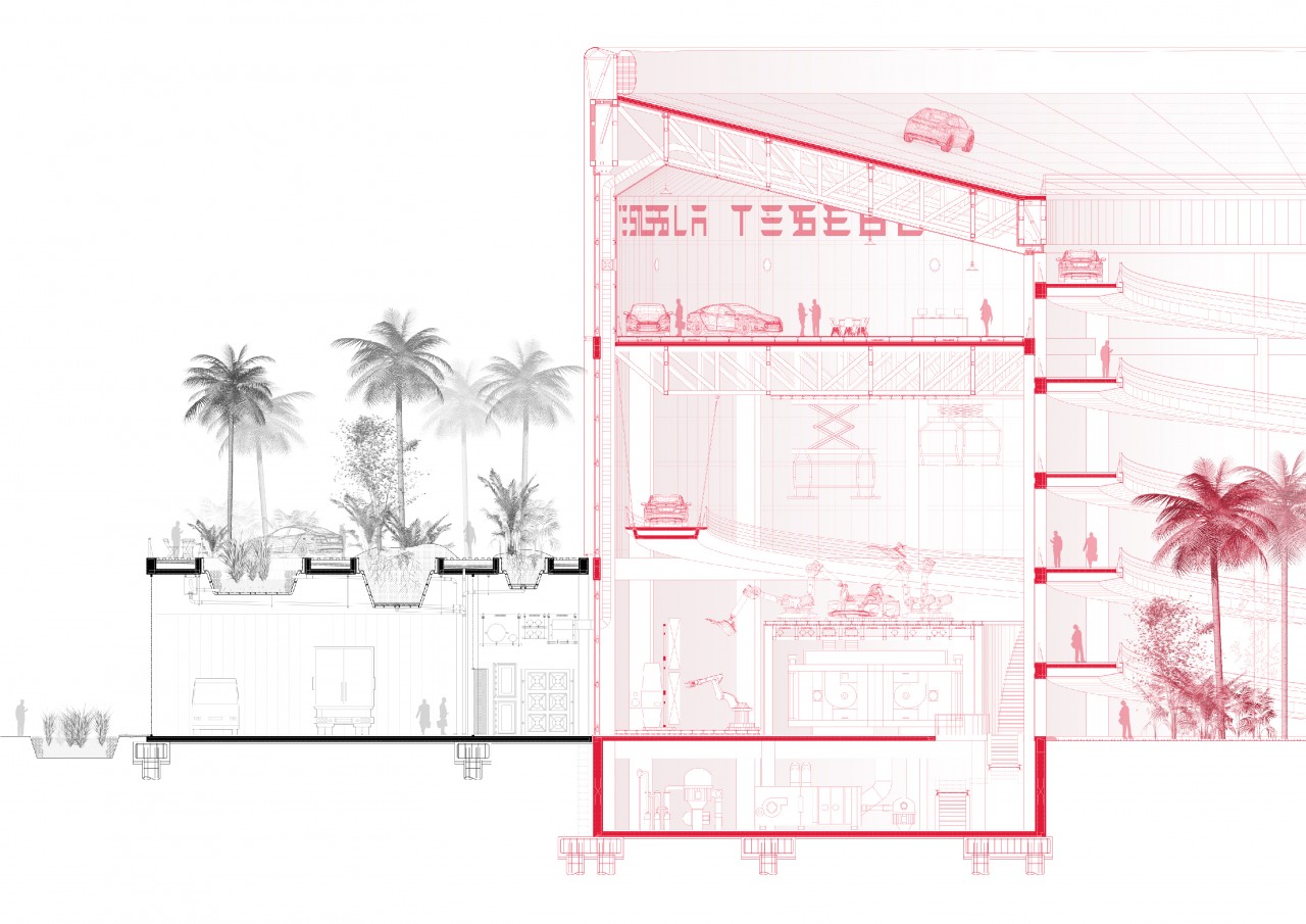 The project arises from a real opportunity: TESLA, a renewable energy and a sustainable mobility company, is looking for a place to construct its new electric vehicle factory in Europe. The fictitious proposal is an infrastructural and corporate-marketing development in Puerto de Cádiz. This infrastructure contains two programmatic variables, hybridizing spaces for clients’ leisure and industrial production.