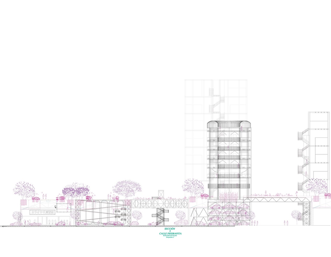 Boosting this public space emerges a new one on the ships (quota 10 m.) Achieved thanks to the reinforcement of the current structure. This one is organized in bands: the outer bands are destined to the vegetation for having greater song and the interior strip is used as a walk. The vegetation in turn is divided in two strips, in the more interior zone there are the shrubs whose pots have less depth; and in the outside, the trees with the bigger maclets.