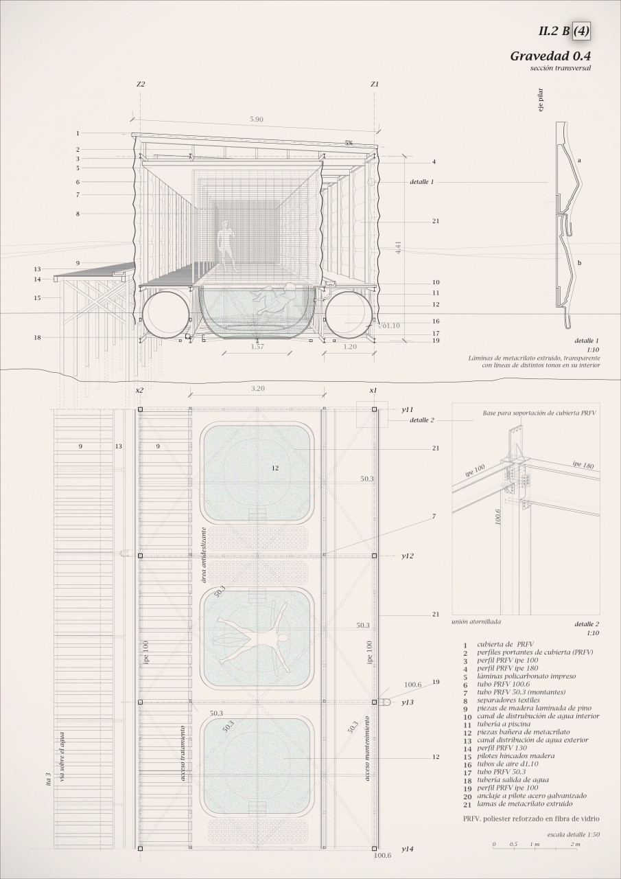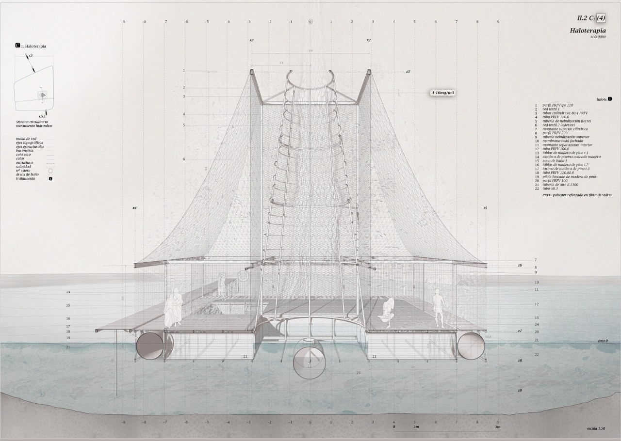 The project intervenes in the life cycle of an old saline of Sancti Petri, current marine farm in decline. With the aim of conserving the saline ecosystem and attending to the health of the human body, thalassotherapy treatments are proposed, which work with the use of different marine environments and the climate as a therapeutic agent, such as flotation, halotherapy and mud therapy. For this, the technical characteristics of the water of the current artificial saline treatments, such as its temperature or concentration, are studied. The extracted data allow to transfer the therapies to a natural environment, integrating them in the morphology of the existing farm.