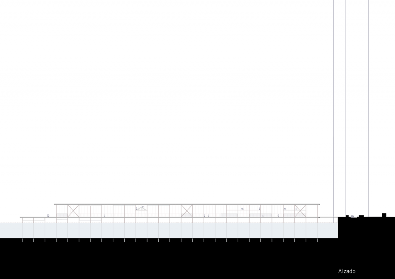 The first exercise was a multifunctional stilt house in Hudson River´s Pier 54, Manhattan. I was interested on making a lightweight, transparent and low impact building, despite its large size. So, I projected a glass frontage for a slender structure arranged over an orthogonal grid.